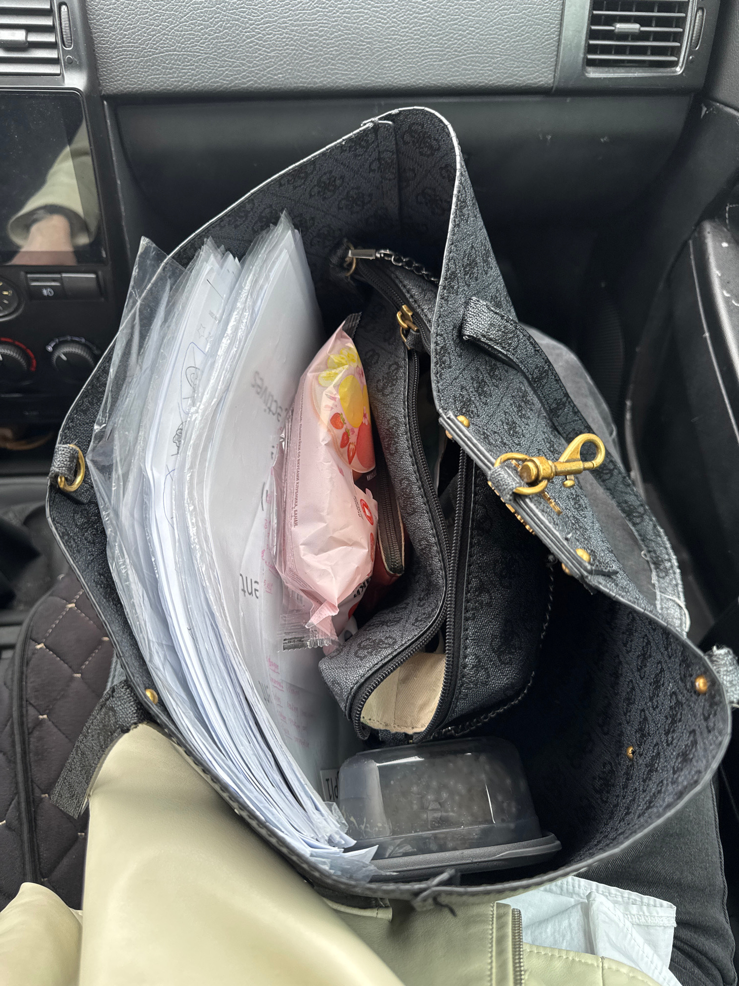 The image shows a gray patterned tote bag, seemingly placed within a vehicle. The bag appears to be open and filled with various items, including a stack of papers in plastic sleeves, a pink and yello…read more