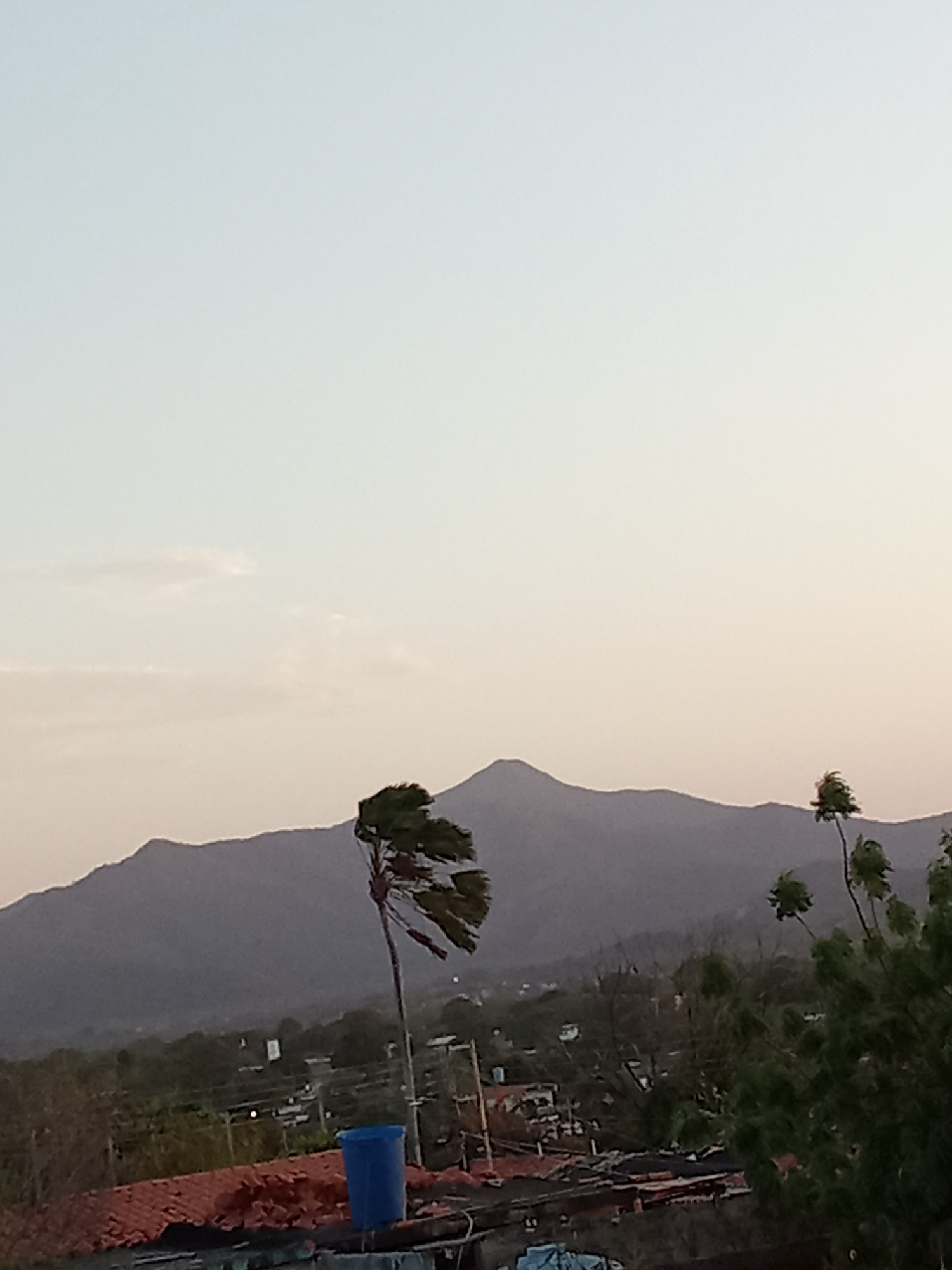 The image depicts a landscape scene in Juan Griego, Venezuela, at what appears to be dusk. In the foreground, rooftops are visible, some covered with terracotta tiles. A blue plastic container sits on…read more