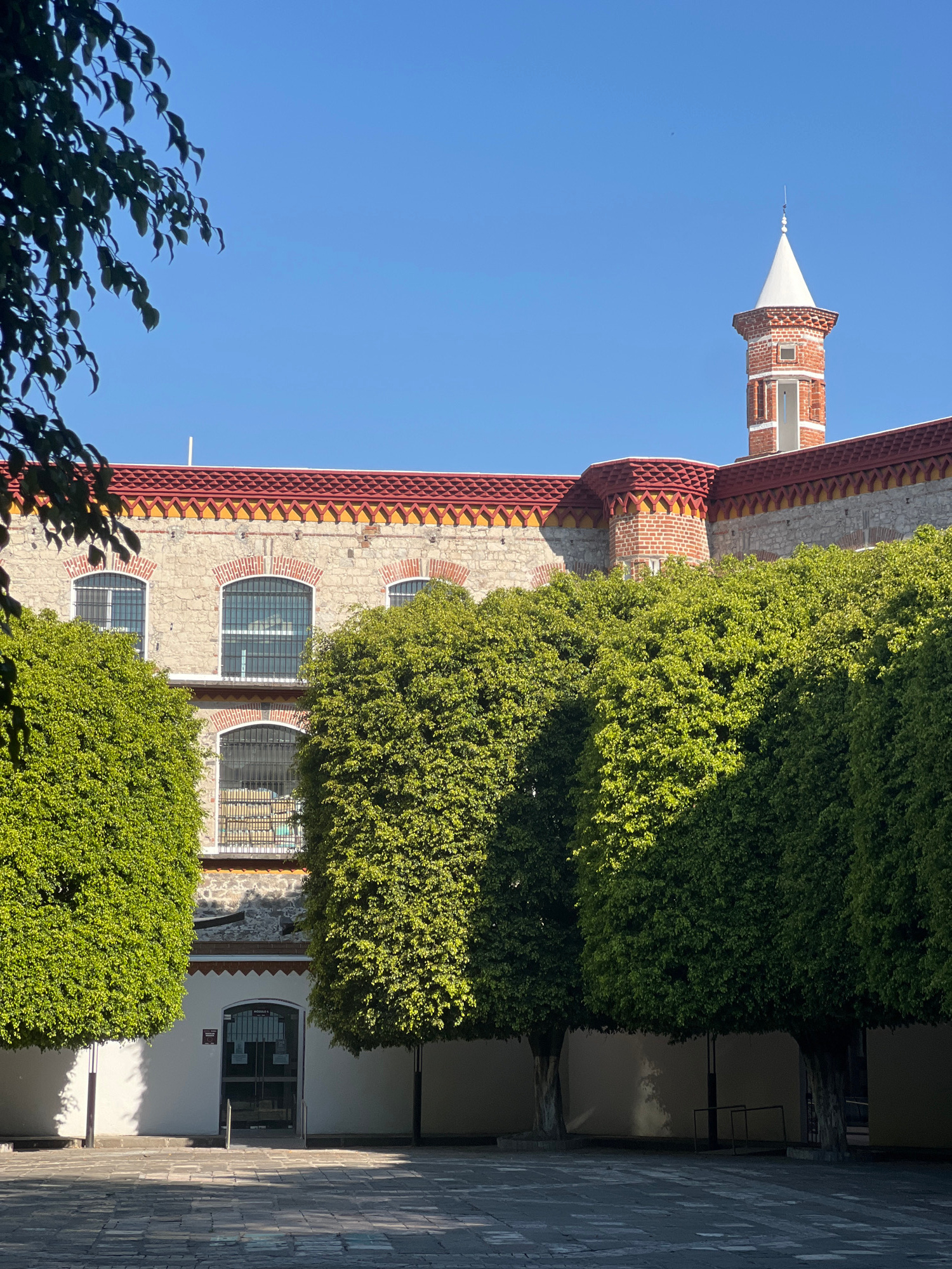 The image shows a building exterior in Puebla, Mexico. The structure has a tower with a white conical roof and brick base. The main building features stone walls, red brick detailing, and arched windo…read more