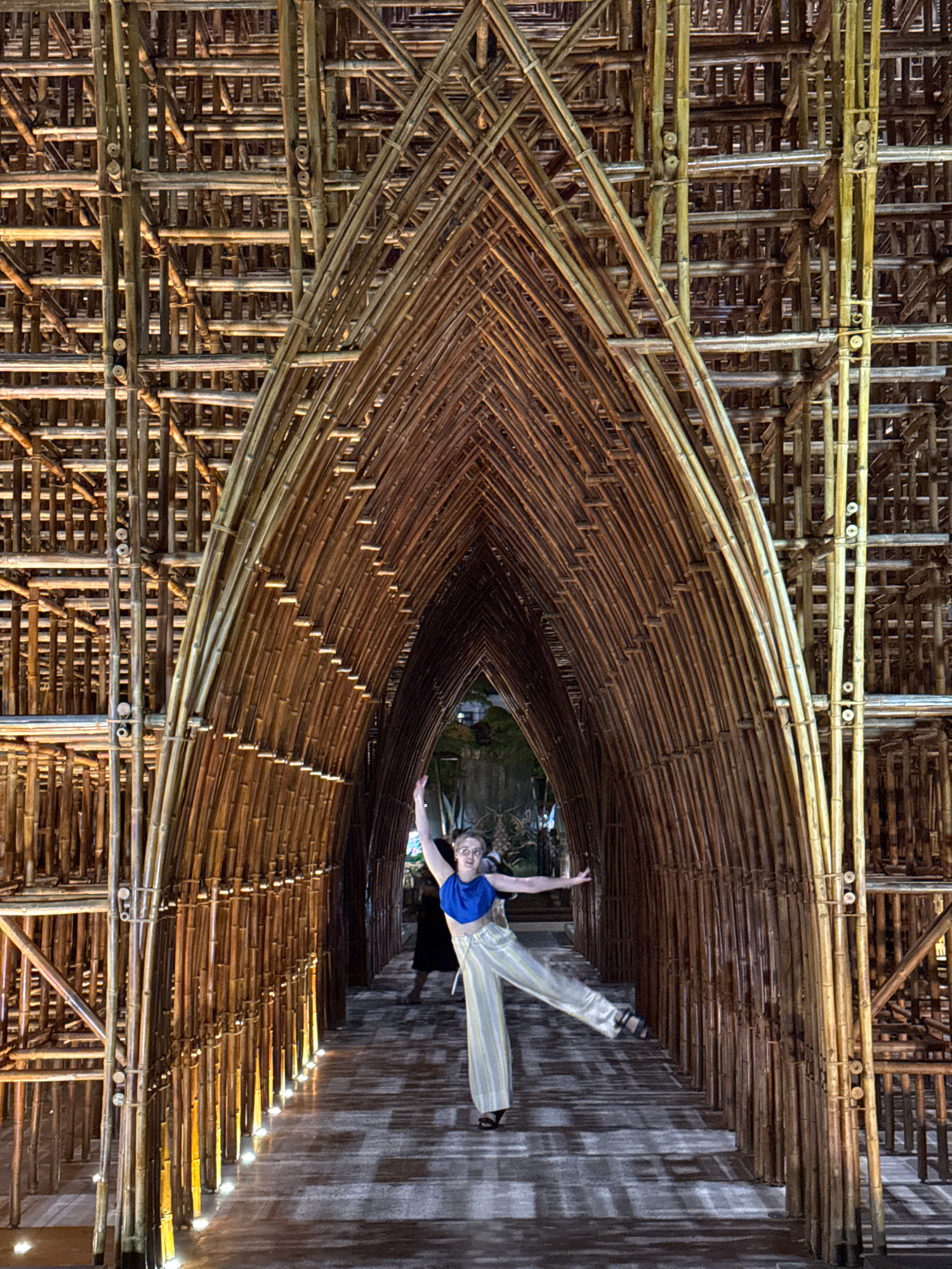 This vertical image features a young woman posing gracefully within an intricately designed architectural structure made entirely of bamboo. The woman, smiling and with her left arm raised, is wearing…read more