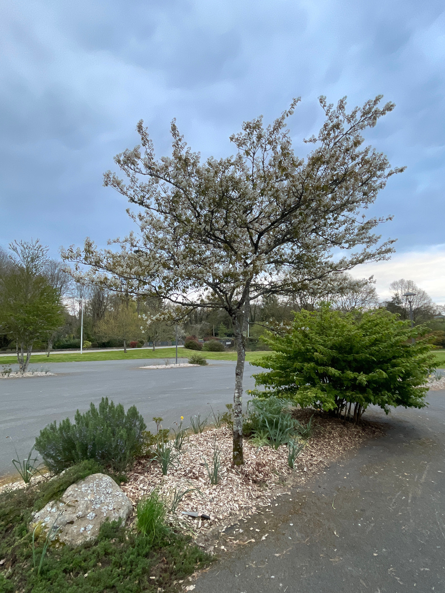 The image depicts an outdoor scene in Le Moustoir, France. A tree with white blossoms is prominent in the foreground. To the right is a smaller green bush adjacent to a paved road. The roadside area i…read more