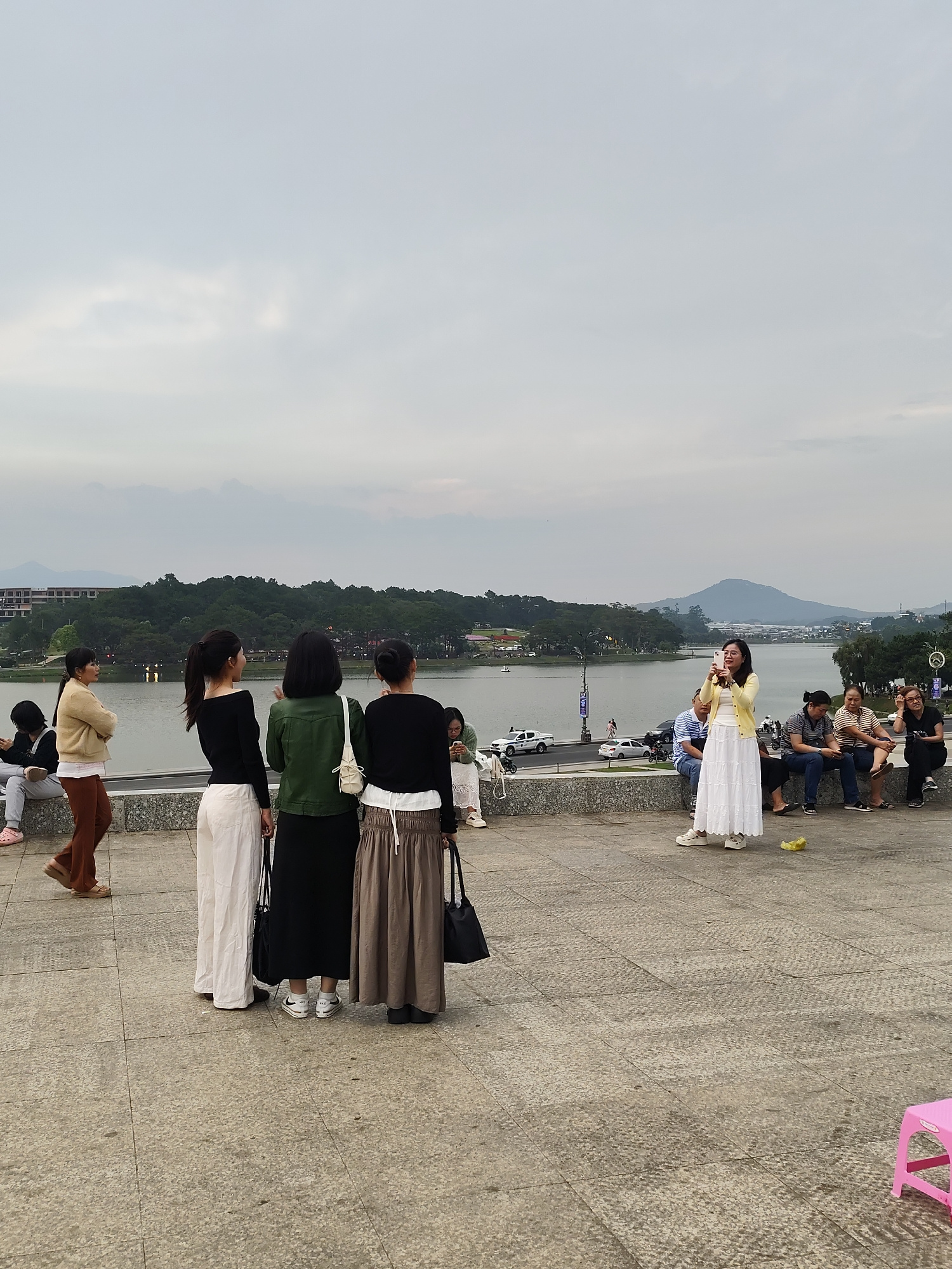 The image captures a scenic view over a lake with forested hills and distant buildings, characteristic of Da Lat, Vietnam, under an overcast sky. In the foreground, on a paved outdoor area, several pe…read more