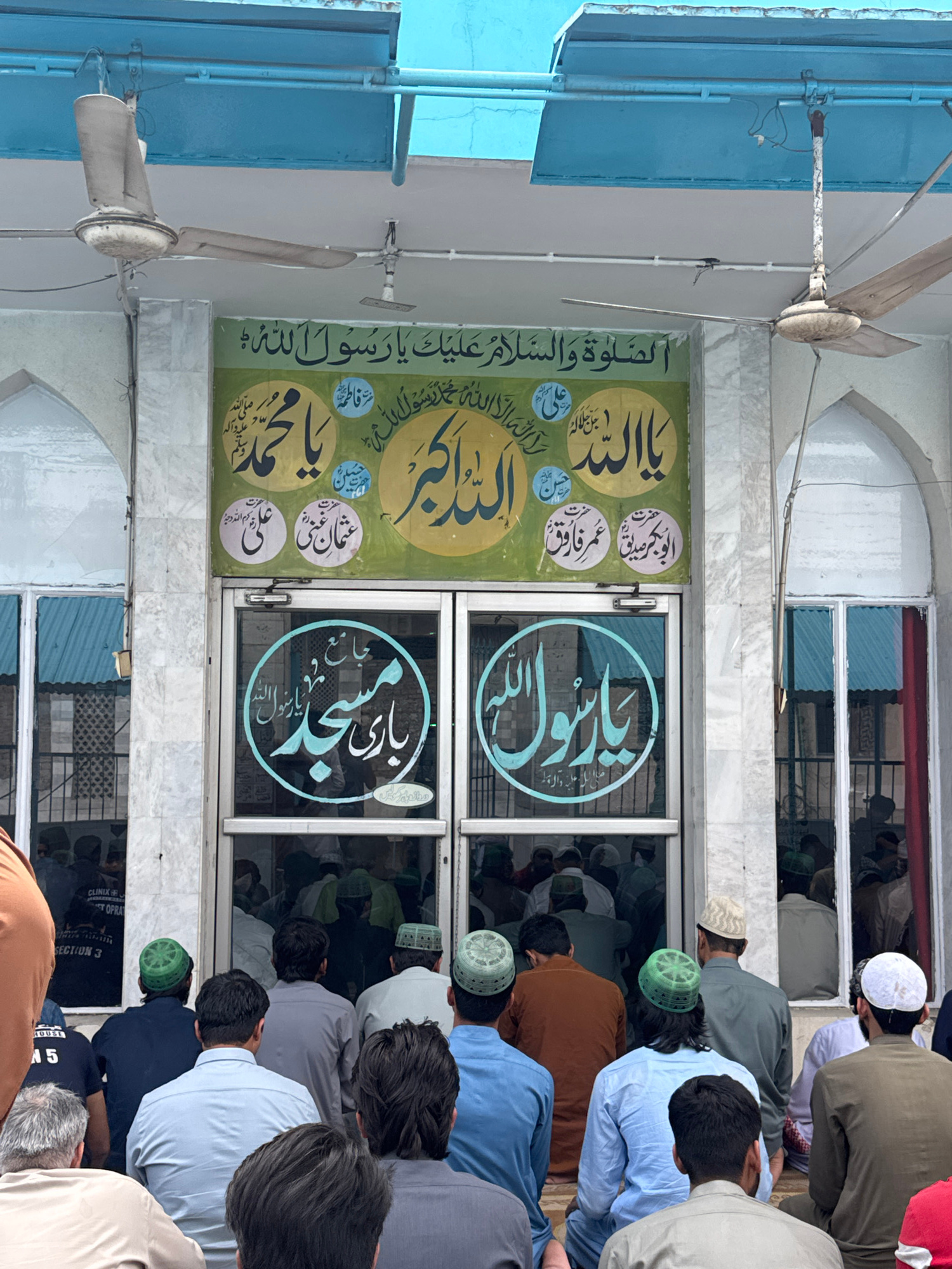 The image captures a vibrant scene of congregational prayer outside what appears to be a mosque or a prayer hall in Lahore, Pakistan, during daylight hours. A group of Muslim men are seen performing S…read more