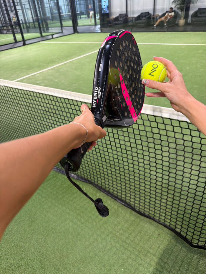 The scene is observed from a first-person perspective within an indoor padel court facility in Choeng Thale, Thailand. In the immediate foreground, a person's left hand grips the black handle of a bla…read more