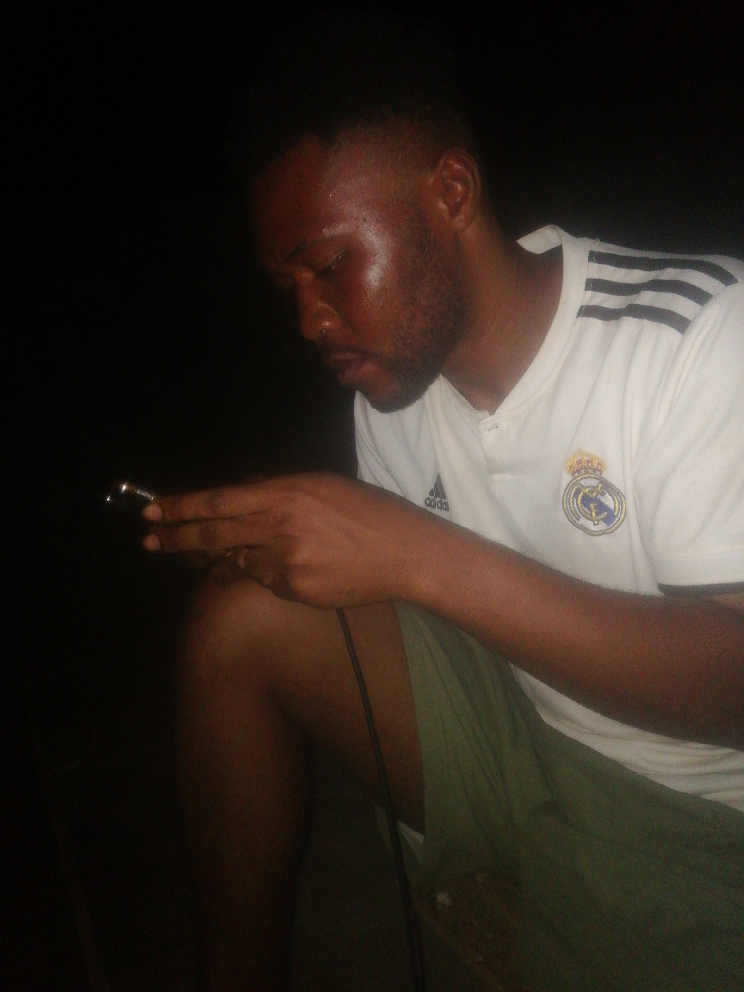 A person with dark skin, wearing a white t-shirt with black stripes on the shoulders and a Real Madrid logo, is looking at a mobile phone in their hands. They are sitting, and a portion of their leg,…read more