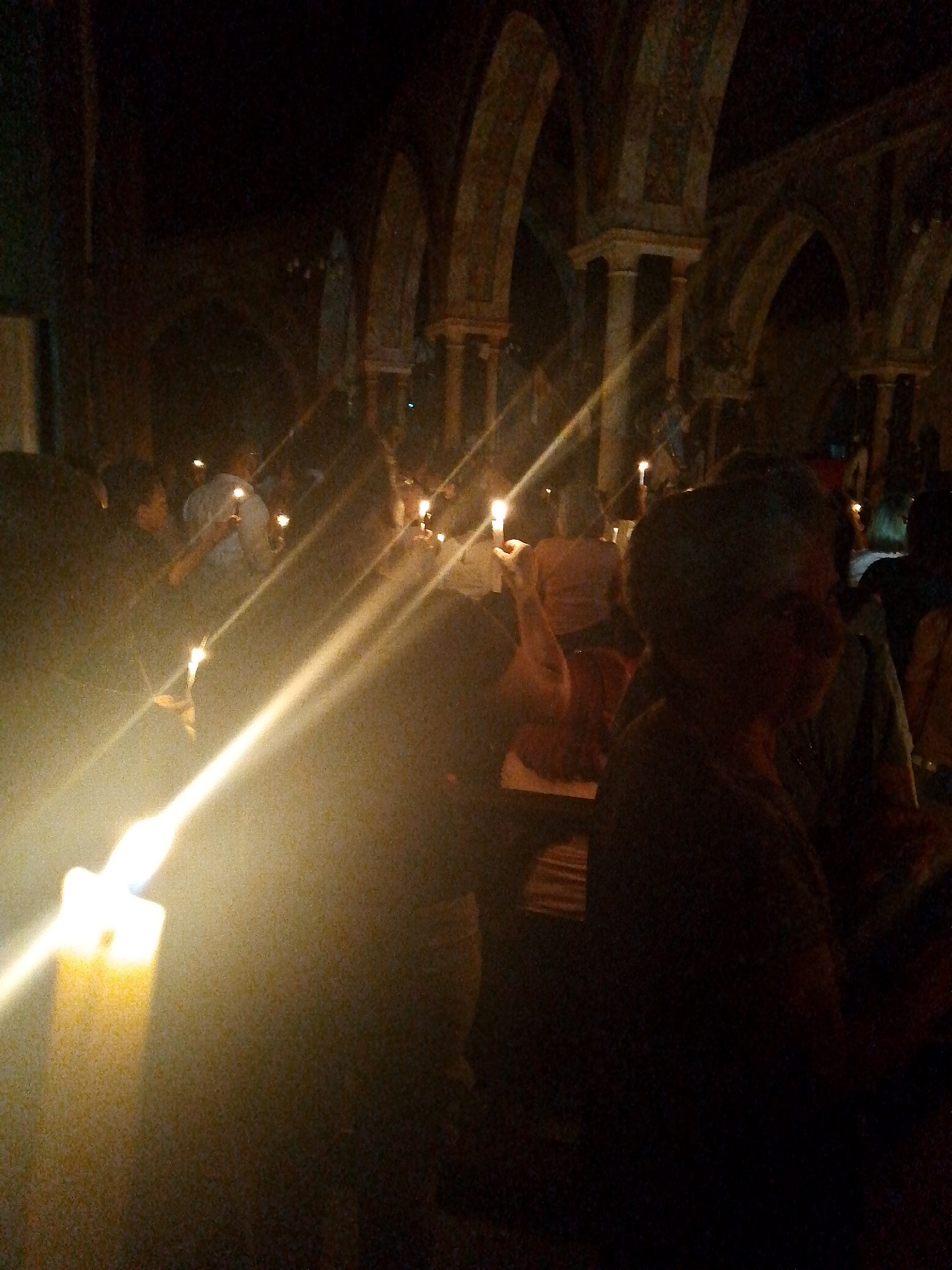 The image shows the interior of a dark, arched structure, likely a church, in Tinaquillo, Venezuela. A crowd of people is gathered, each holding a lit candle. The arches and columns of the building ar…read more
