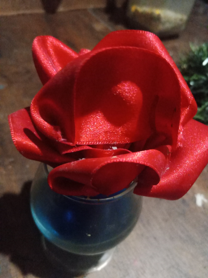 A red, ribbon-like rose fills the frame, its satin texture reflecting light. The rose is set in a small, rounded vase filled with blue liquid. The scene is illuminated by a soft, warm light. To the up…read more