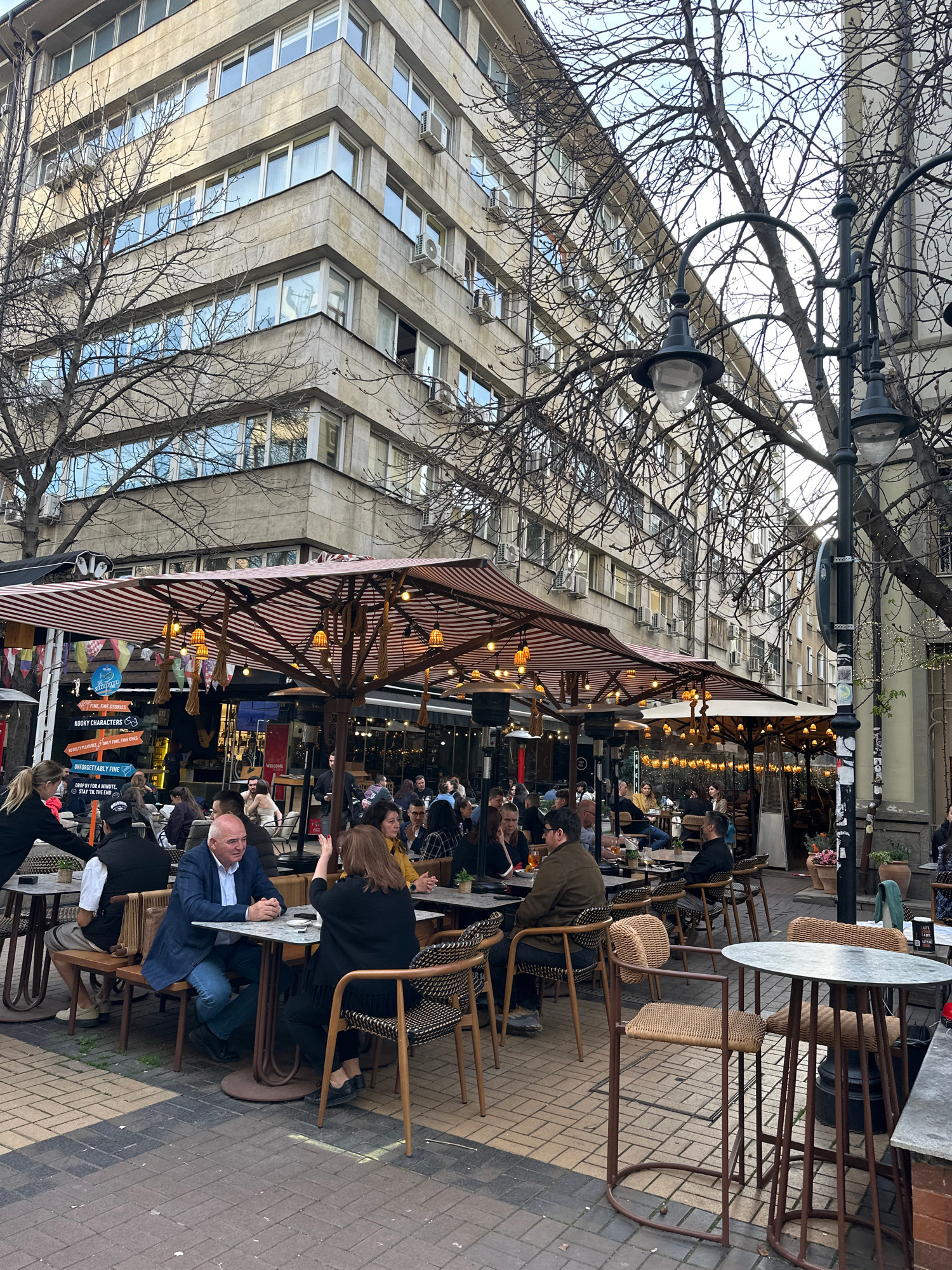 The image shows an outdoor cafe scene in Sofia, Bulgaria. The cafe is situated on a sidewalk with tables and chairs occupied by patrons. A large building looms in the background, its facade marked by…read more