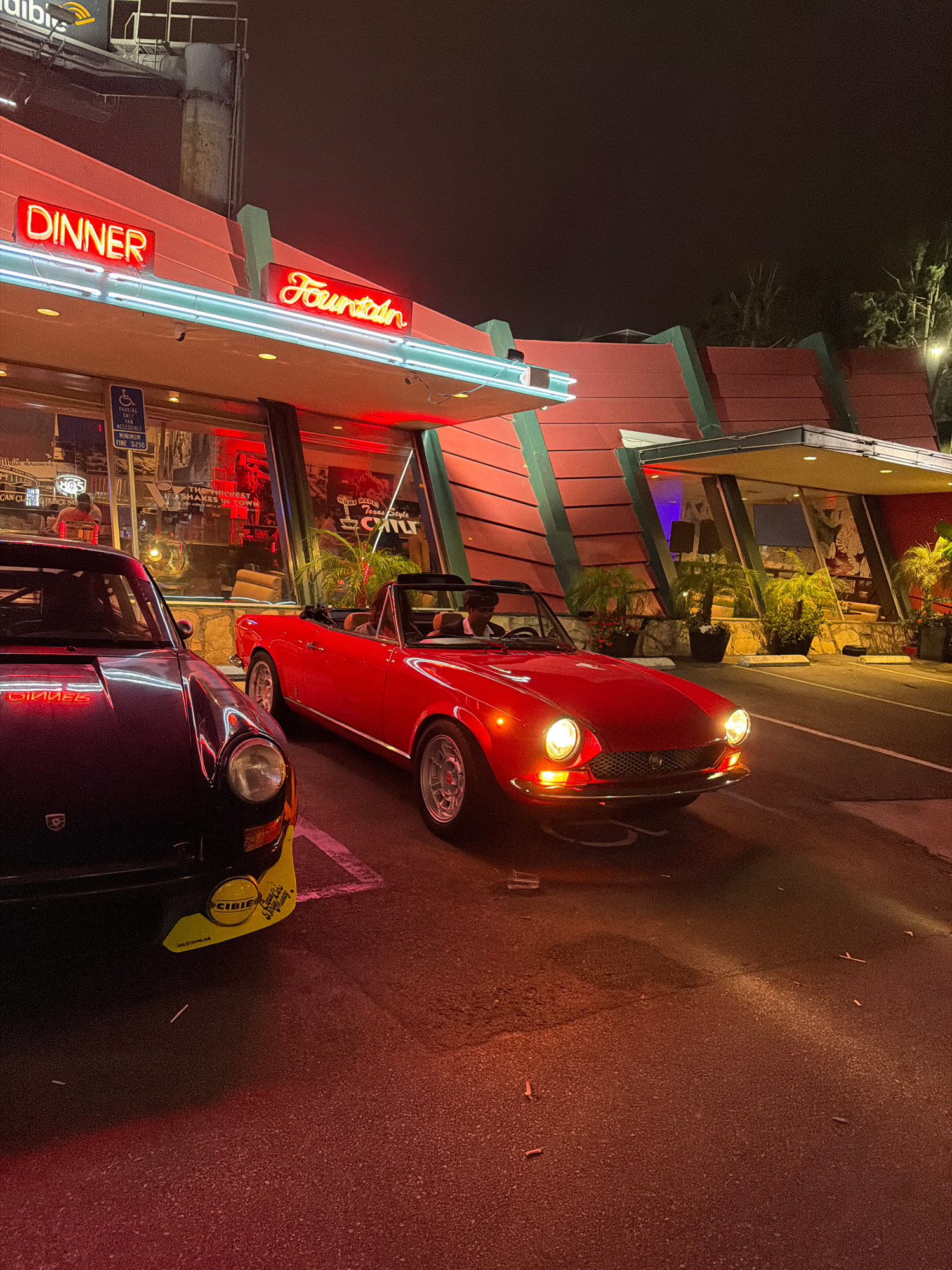 Captured at night in West Hollywood, USA, the scene focuses on the exterior of "Mel's Drive-In." The restaurant, known for its "Dinner Fountain," features retro architectural details and neon signs. T…read more