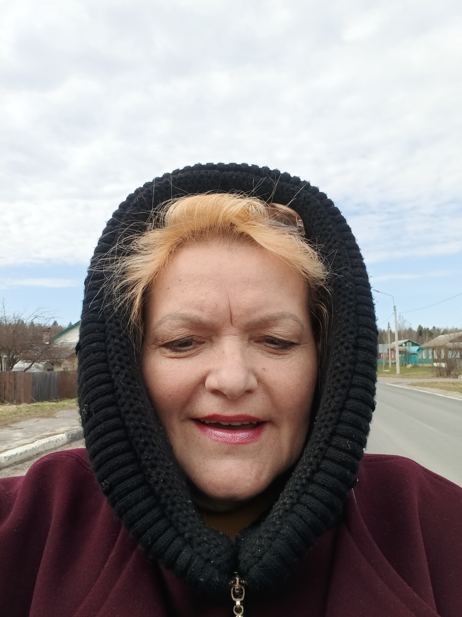 A medium shot captures a woman outdoors, with a black hooded garment framing her face. She has light orange hair and is wearing red lipstick. Her expression is one of slight amusement or happiness. T…read more
