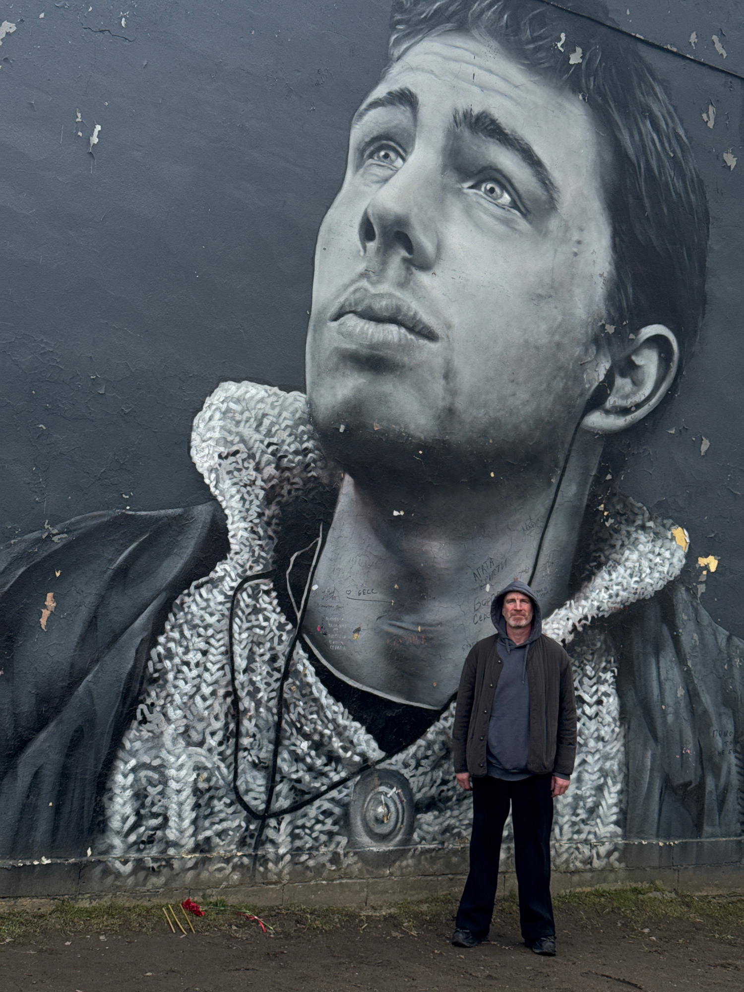 A man stands to the right of a large black and white mural on a wall in Saint Petersburg, Russia. The mural depicts a close-up of a young man's face with a knit collar. The man standing in front of th…read more