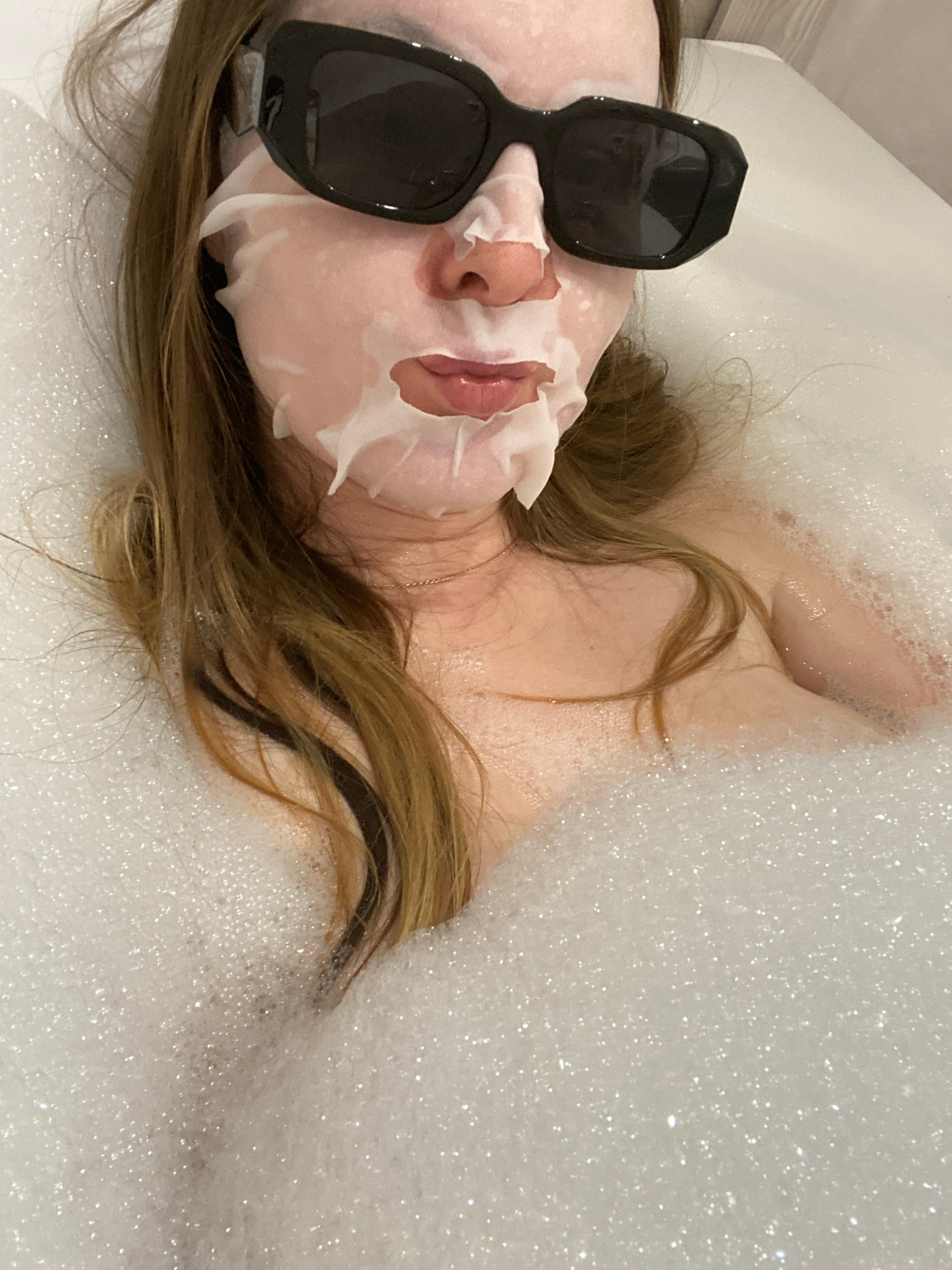 A woman is lying in a bathtub filled with bubbles. She is wearing a facial mask and sunglasses. The location is not discernible from the image.