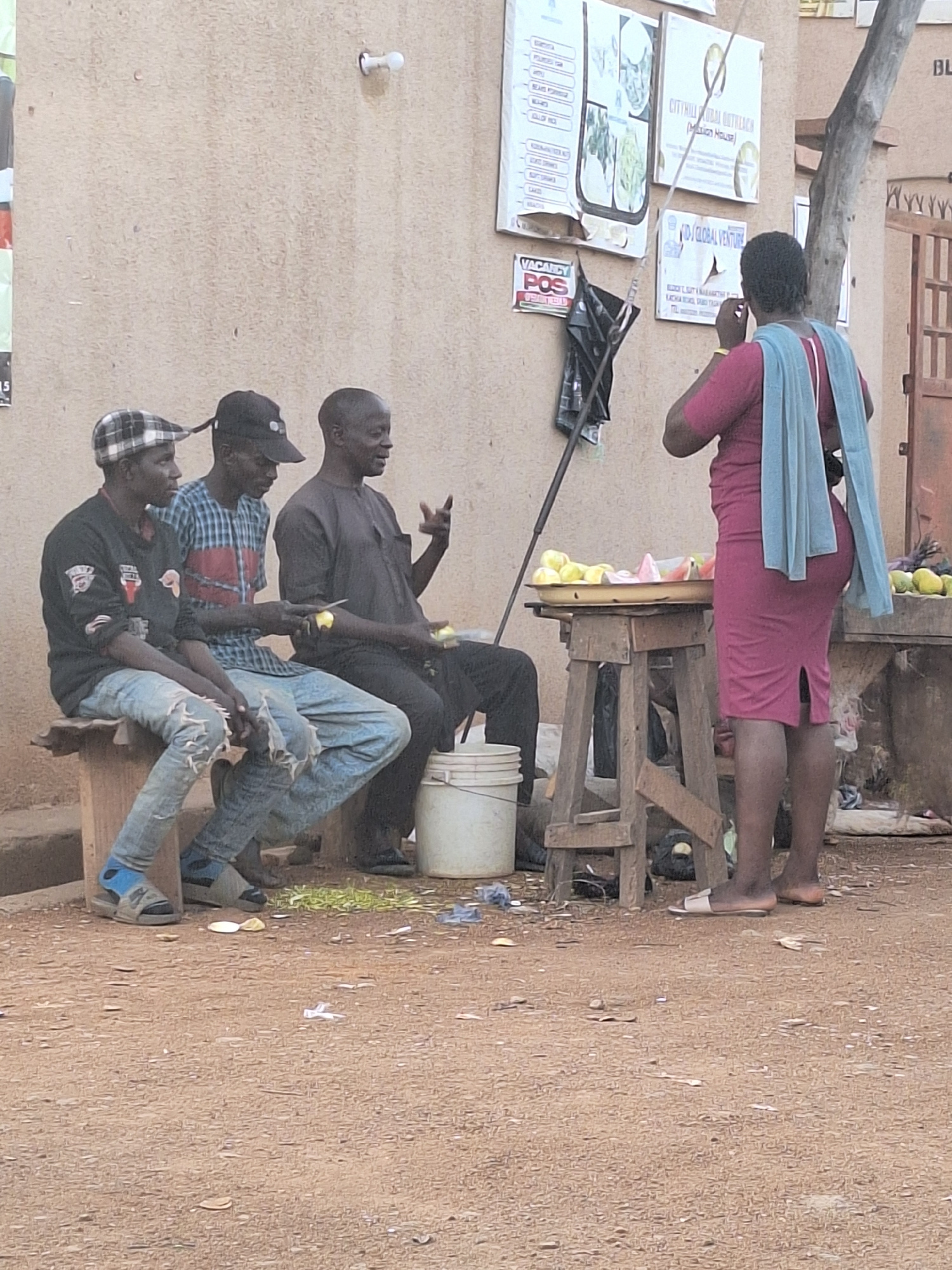 In Sabon Tasha, Nigeria, a street scene shows a woman in a rose-colored dress and light blue shawl standing at a wooden stall selling yellow fruits. Adjacent to her, three men are seated on a wooden b…read more