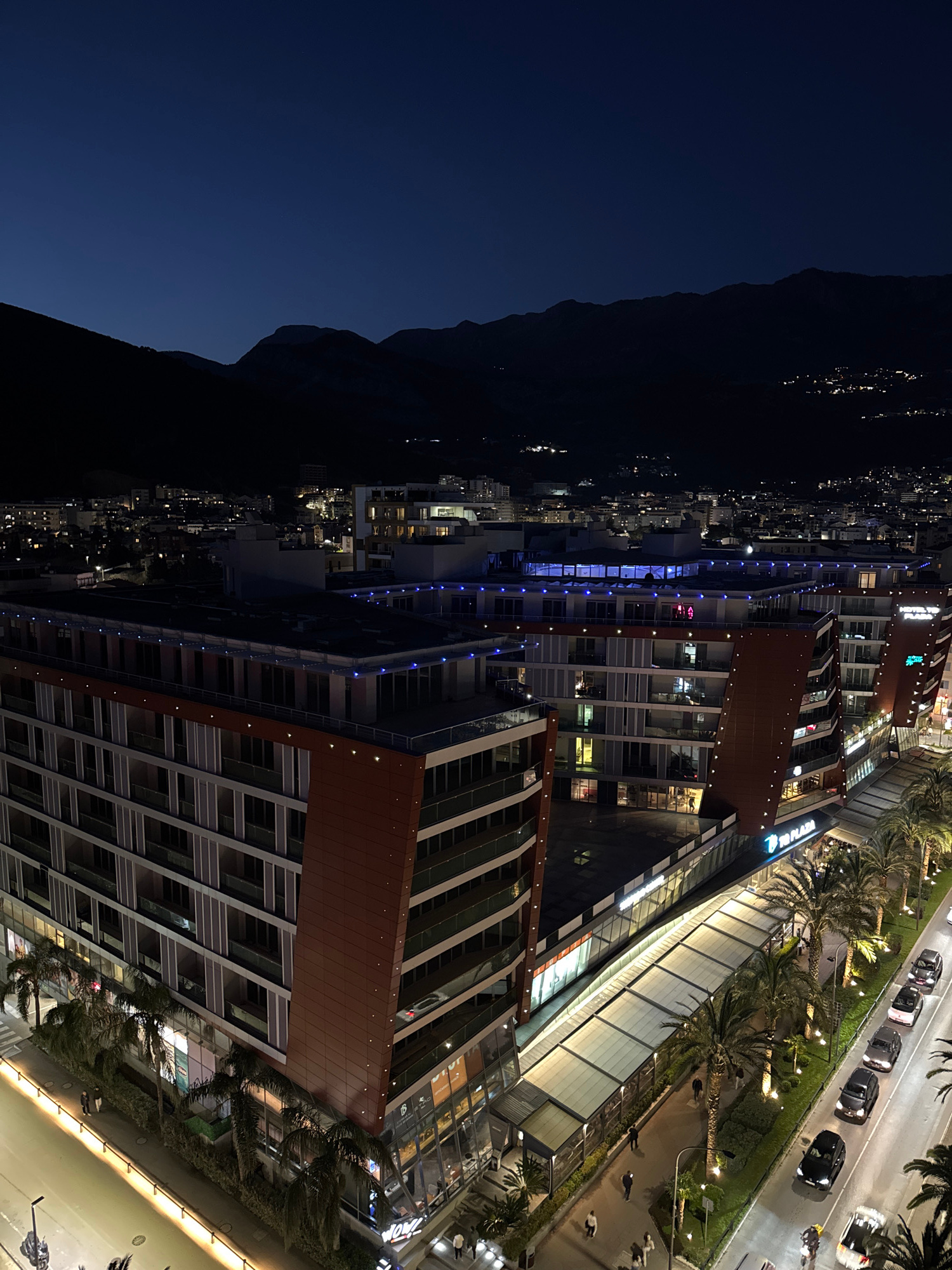The image depicts a nighttime cityscape in Budva, Montenegro, taken from a high vantage point. In the left portion of the frame, a dark mountain range is visible against a deep blue twilight sky. To the right, illuminated buildings dominate the scene. These modern structures feature a mix of residential and commercial spaces, characterized by large windows and distinct architectural designs. Between the buildings, the city lights twinkle, marking a busy urban environment. Along the right edge, a well-lit street scene unfolds, showing cars moving along the road and pedestrians strolling along the sidewalks shaded by palm trees. The atmosphere suggests a vibrant and bustling nightlife. | Open Wire
