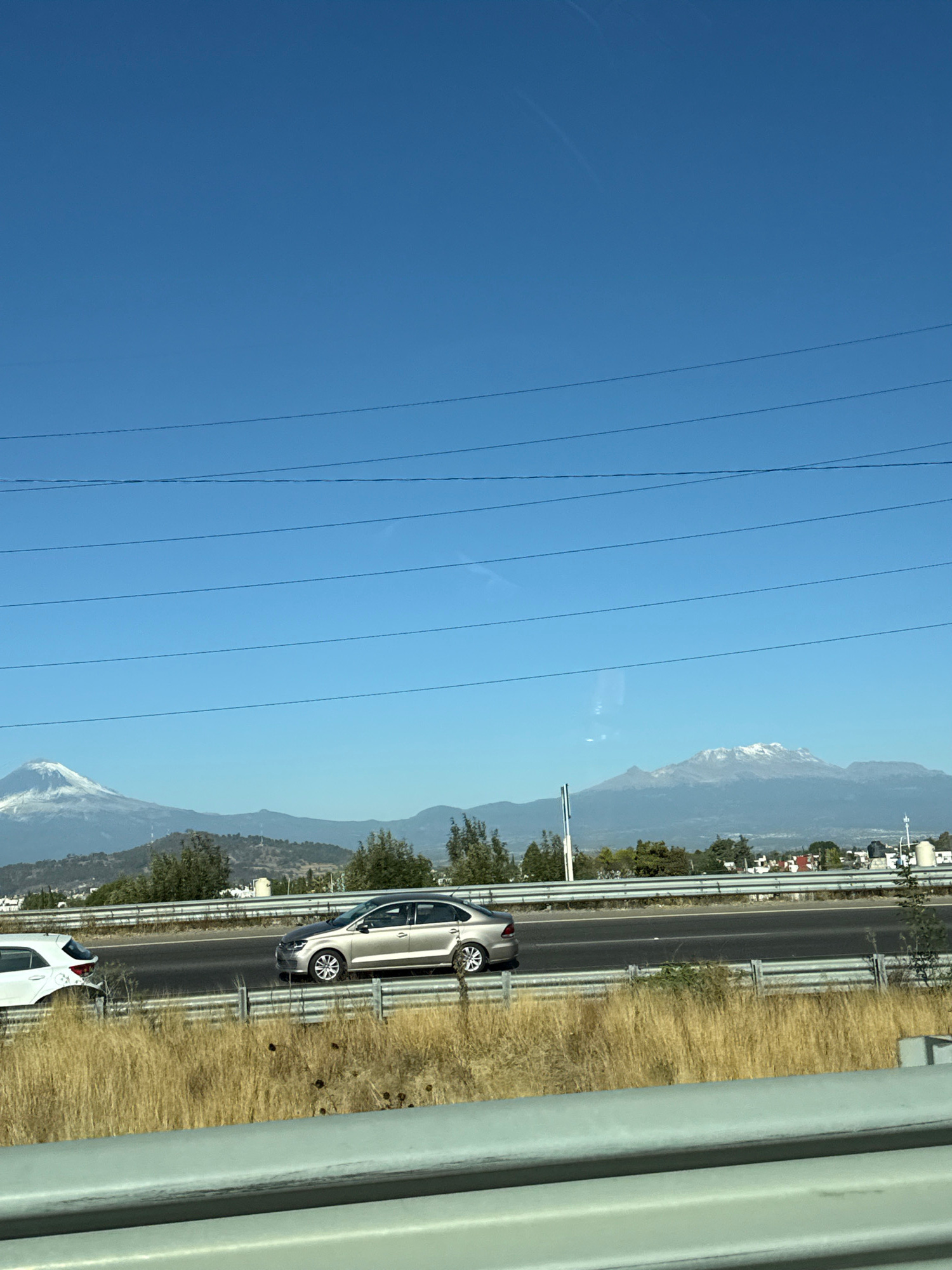 The image captures an outdoor scene on a clear, sunny day, overlooking a multi-lane highway in the vicinity of San Pedro Cholula, Mexico. In the immediate foreground, a light-colored, metallic guardra…read more