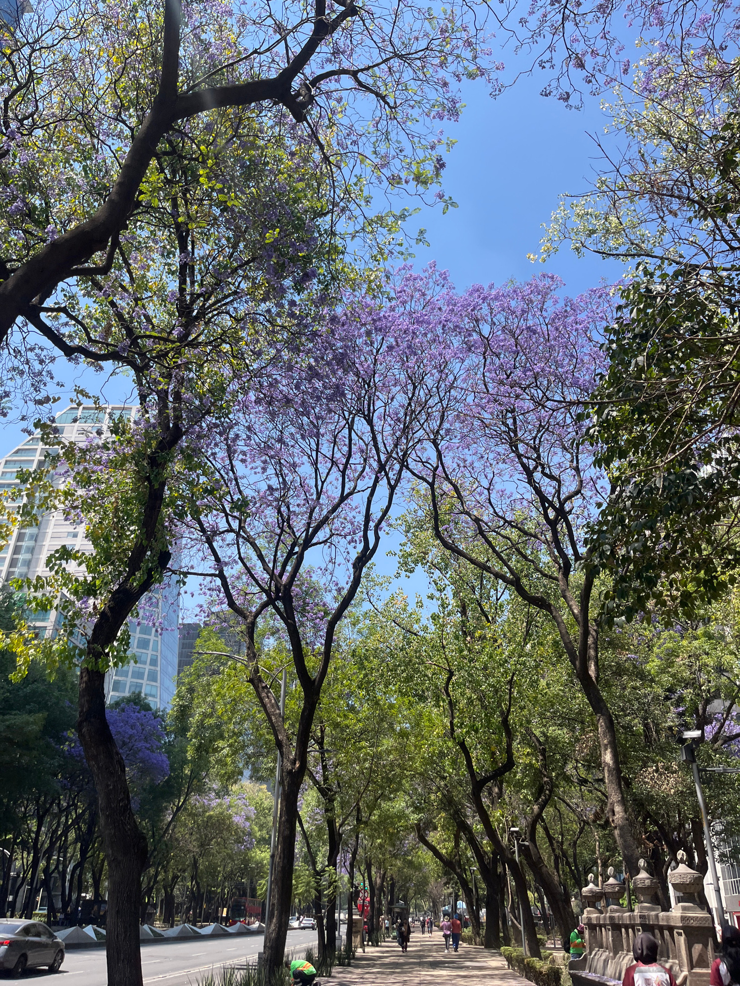 The photograph shows a street in Mexico City, Mexico, lined with jacaranda trees in bloom. The trees are the dominant feature, with their branches and purple flowers filling much of the frame. In the…read more