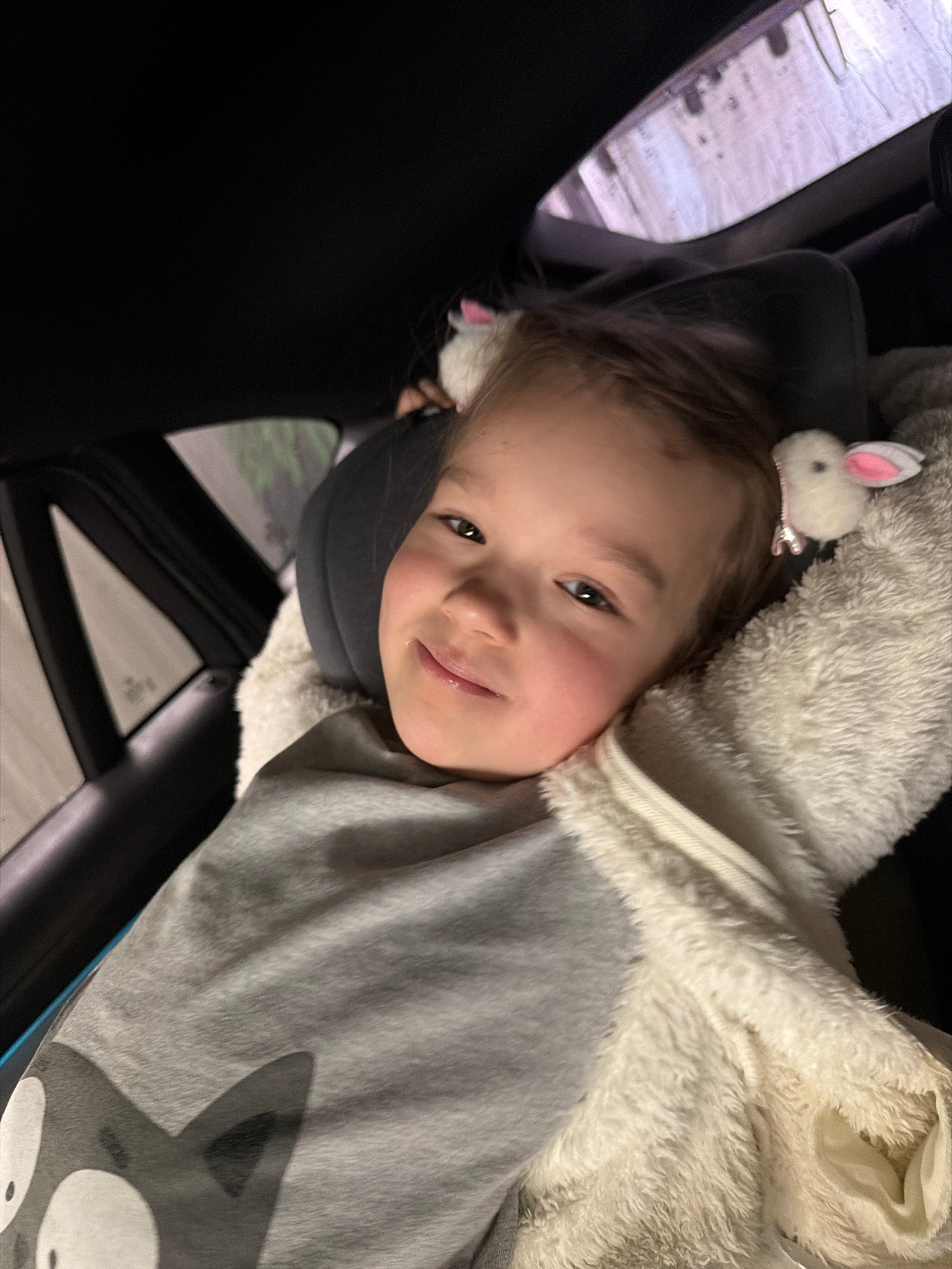 A young child with light brown hair and a rabbit-shaped hair clip is resting in a car. She is wearing a gray shirt with a wolf design and is partially covered by a fluffy, off-white blanket. The child…read more