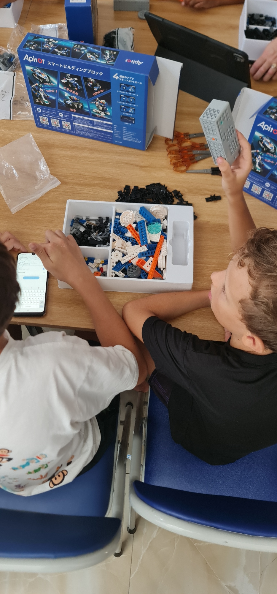 Two children are sitting at a wooden table, assembling an "Apitor Smart Building Block" set. One child, wearing a black shirt, is holding a remote control-like component. The other child, in a white p…read more