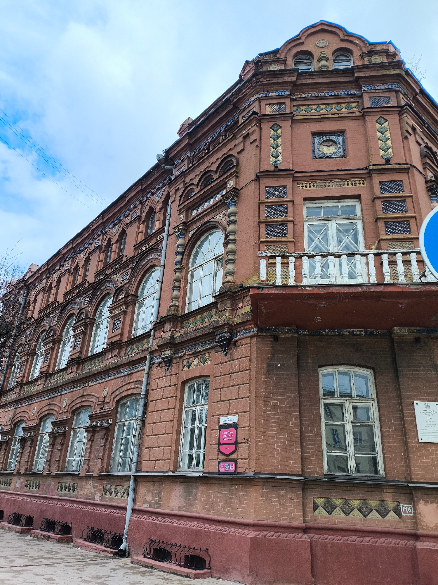 A grand, multi-story brick building, likely a historical architectural monument, stands prominently under an overcast blue sky in Smolensk, Russia. The building, constructed with red brick, showcases…read more