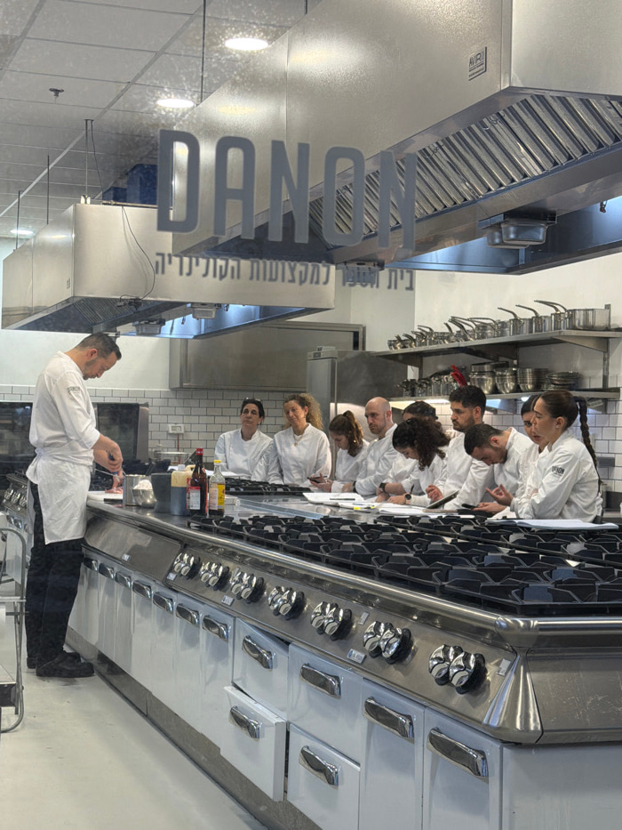 A culinary class setting. A chef stands facing students clad in white coats, all gathered around a large stainless steel oven/stove. Overhead, a commercial kitchen exhaust hood dominates the scene. A…read more