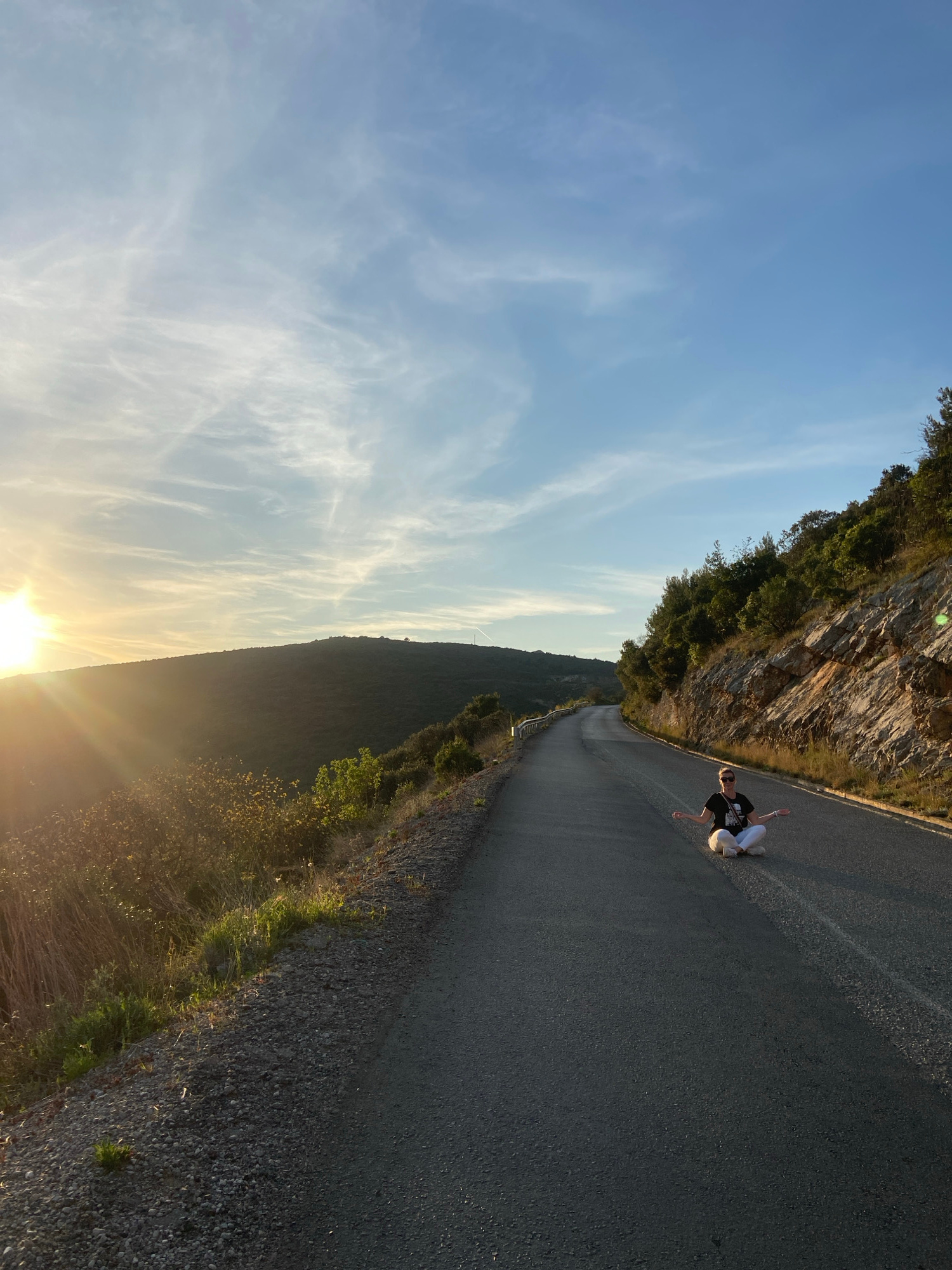 A person is sitting on a paved road that winds through a mountainous landscape in Višnjevo, Montenegro. The person is wearing dark clothing on top, white pants, and white shoes. They are positioned in…read more