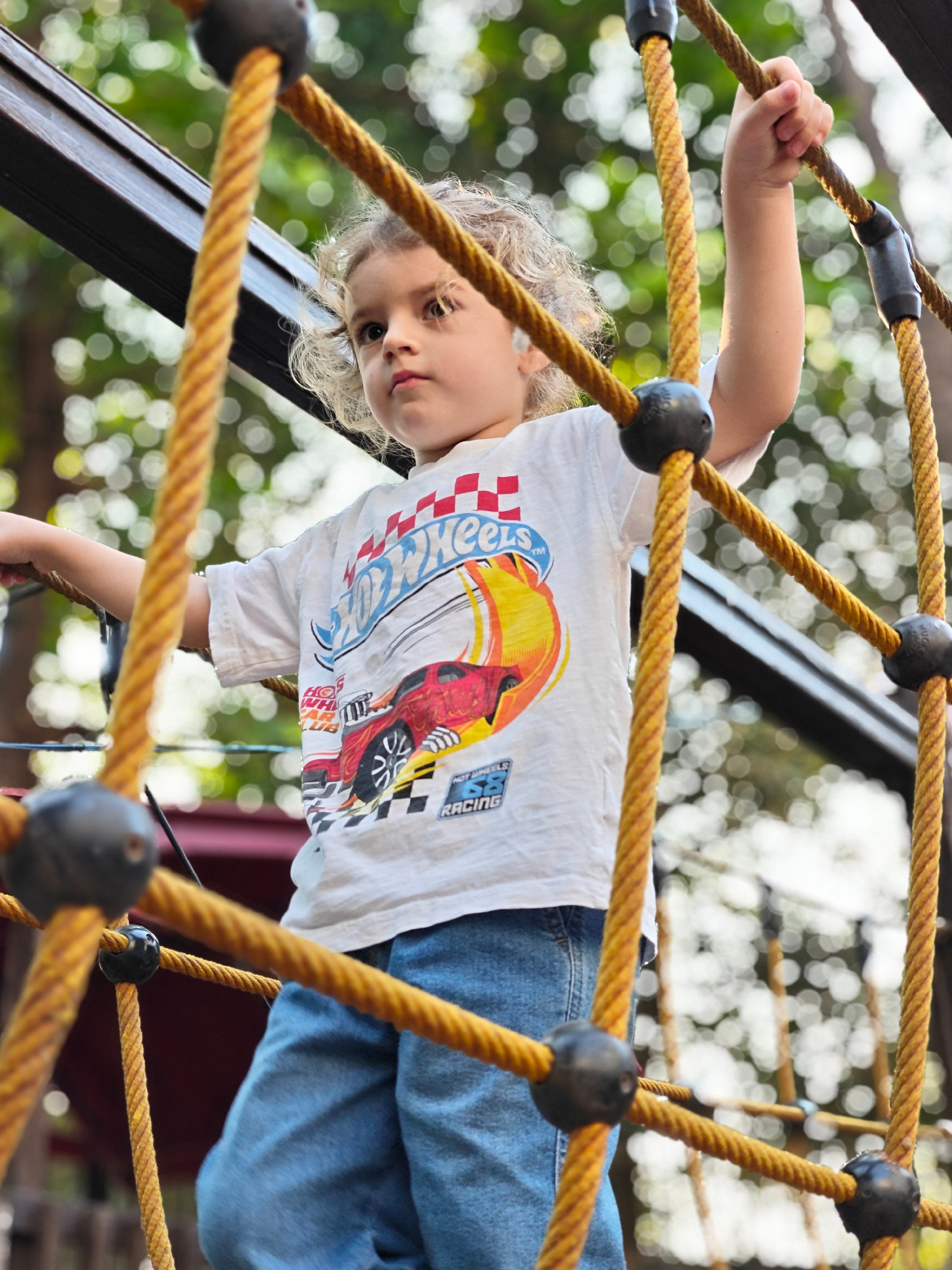 A young child, approximately 3-6 years old, with light, curly hair, is depicted standing on a yellow-orange rope climbing net within an outdoor playground in Mumbai, India. The child wears a white shoβ¦read more