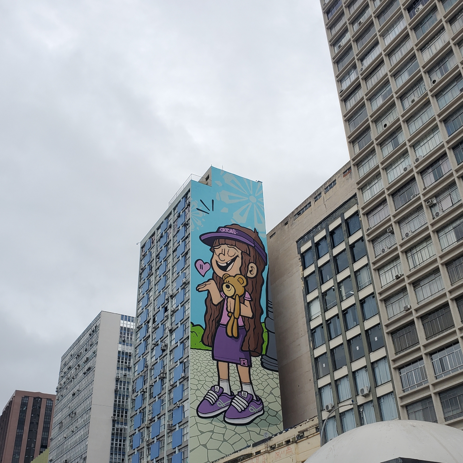 The image shows a mural on the side of a building in Curitiba, Brazil. The mural depicts a cartoon girl with brown hair wearing a purple hat and dress, hugging a teddy bear. She is smiling and has a h…read more