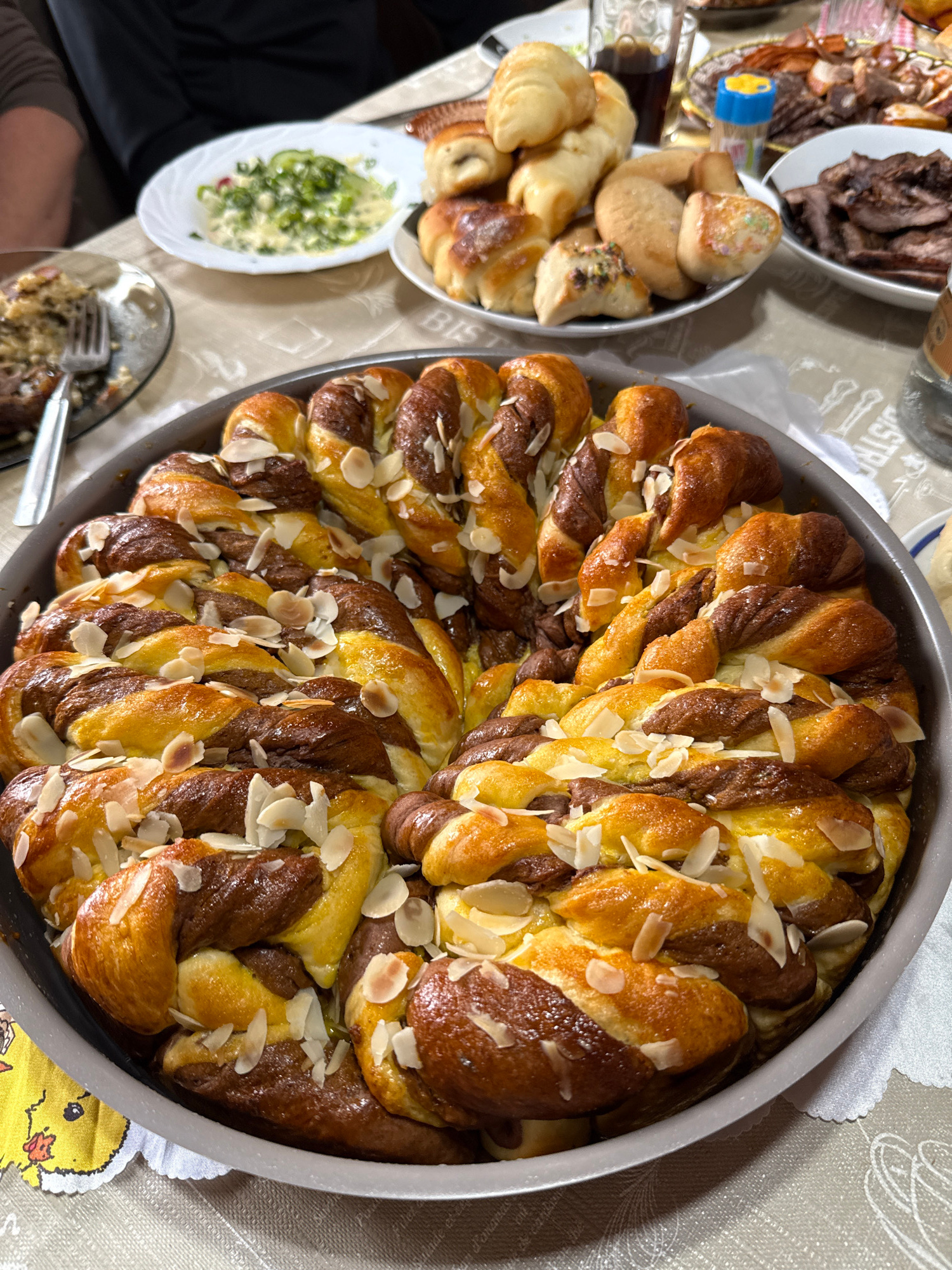 The image captures a dining table setting with various dishes, possibly in a home in Vinarovo, Bulgaria. A round braided bread, topped with sliced almonds, occupies the center of the frame, sitting in…read more