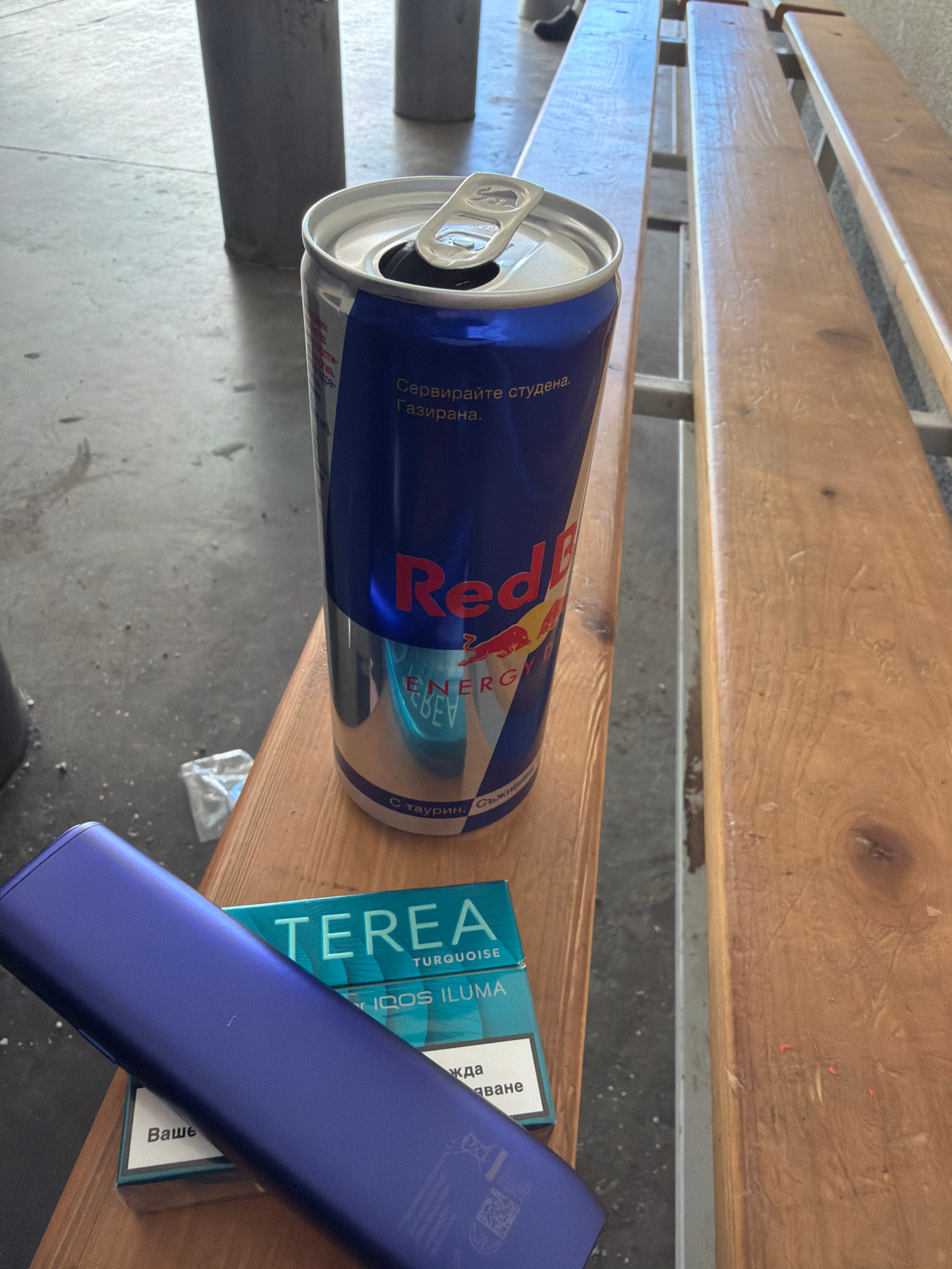 The image shows a partially consumed can of Red Bull energy drink lying on a wooden bench, next to a pack of Terea Turquoise IQOS Iluma tobacco sticks and a blue IQOS Iluma device. The text on the Red…read more