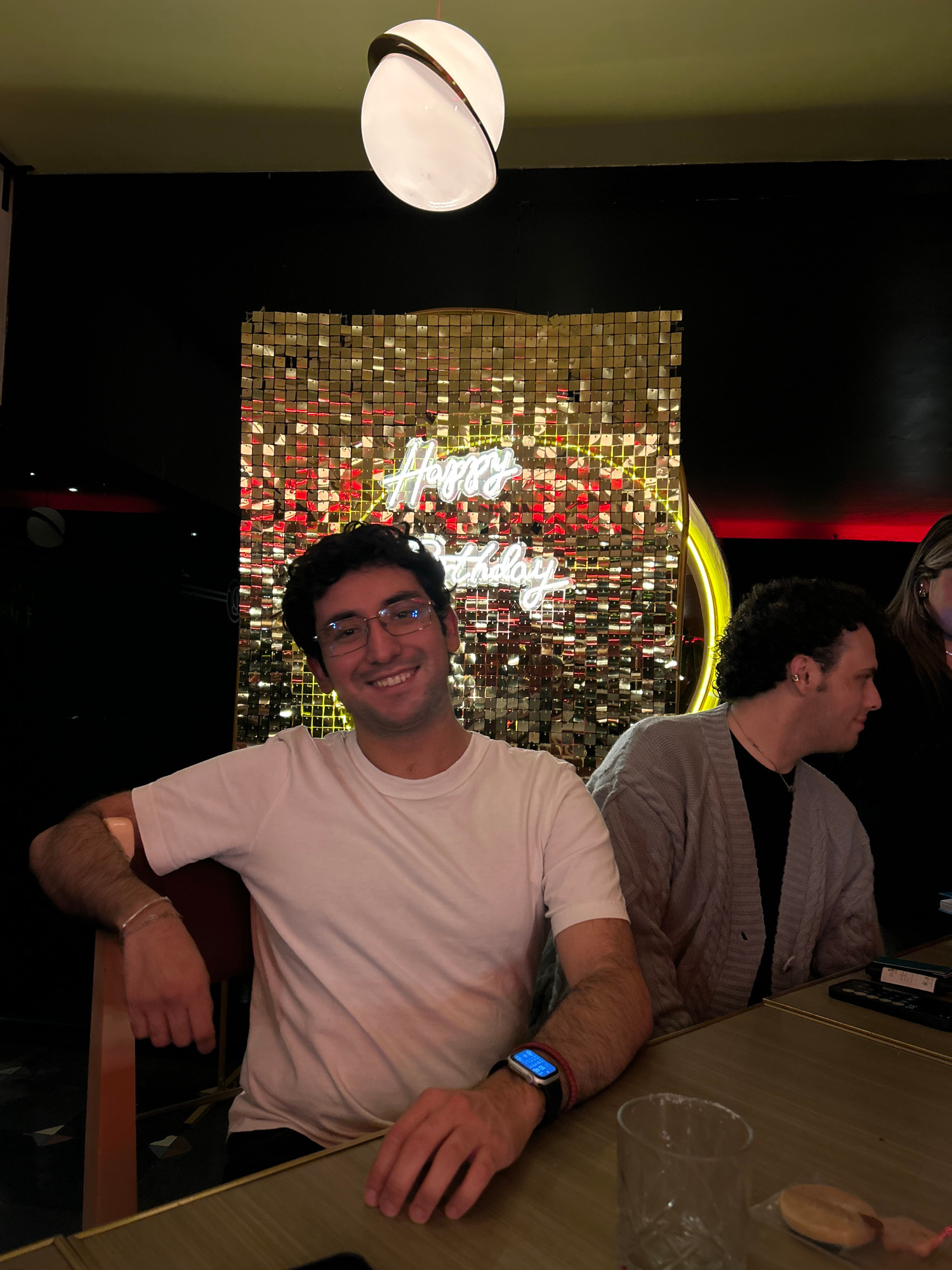 The image depicts two men seated at a table in an indoor setting with a festive atmosphere. The man in the foreground is wearing a white t-shirt, glasses, and a smartwatch, and he is smiling at the ca…read more