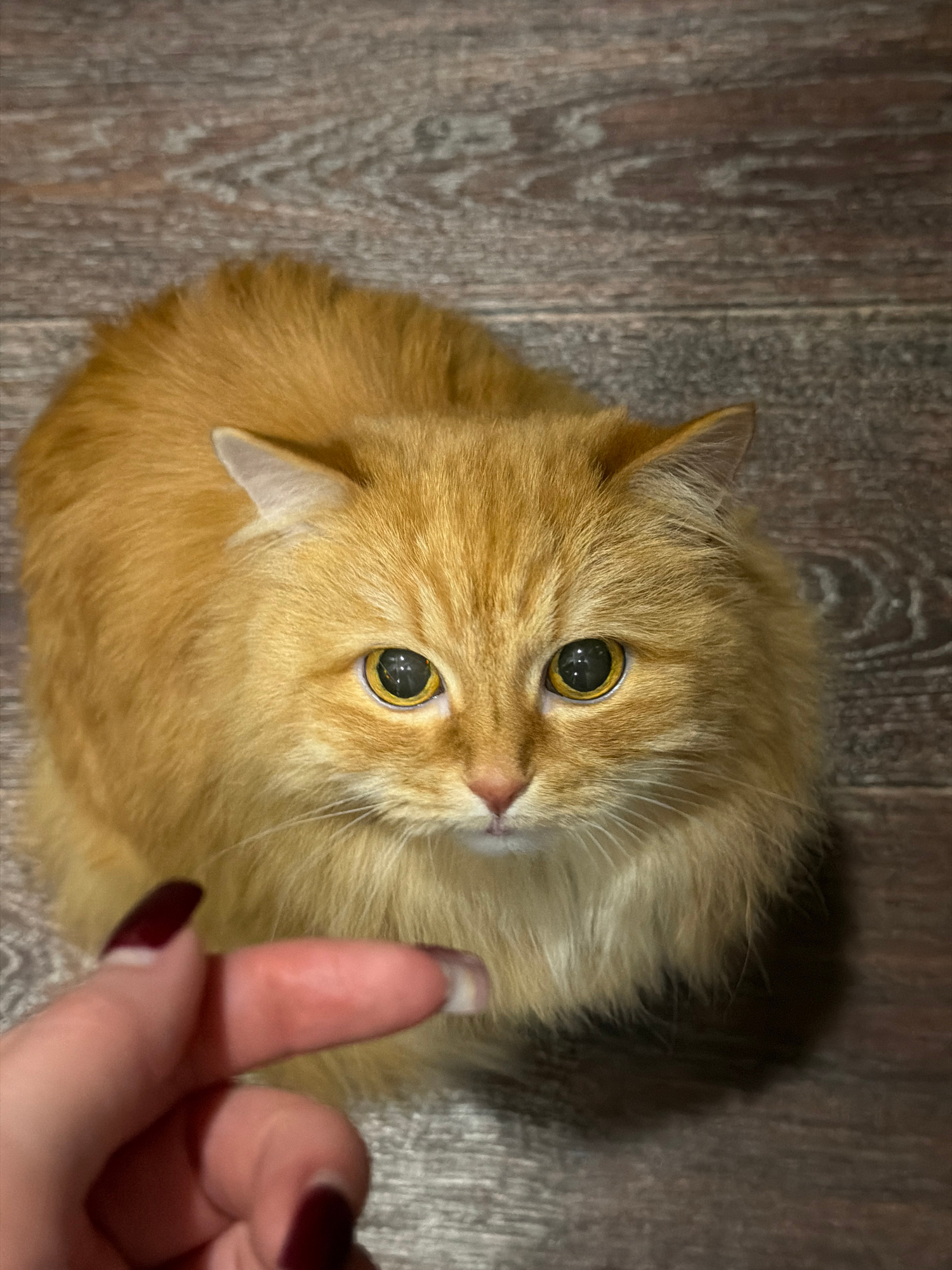 An orange, fluffy cat with prominent, dilated black pupils and narrow golden irises is captured in a high-angle shot, looking upwards and slightly to its right. The cat is situated on a wooden floor,…read more
