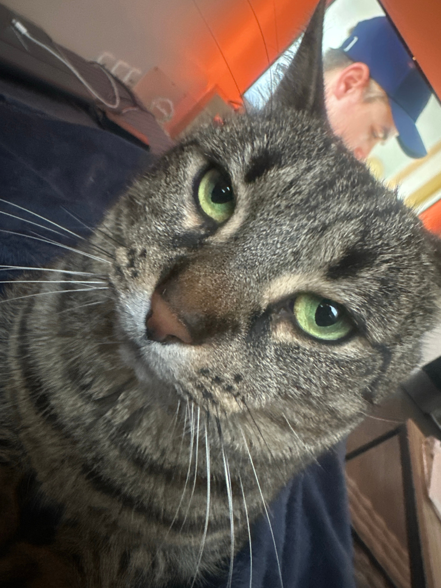 A close-up image depicts the face of a brown tabby cat with green eyes, prominent whiskers, and a pink nose. The cat is resting on a dark blue blanket. Behind the cat, partially visible, is a person w…read more