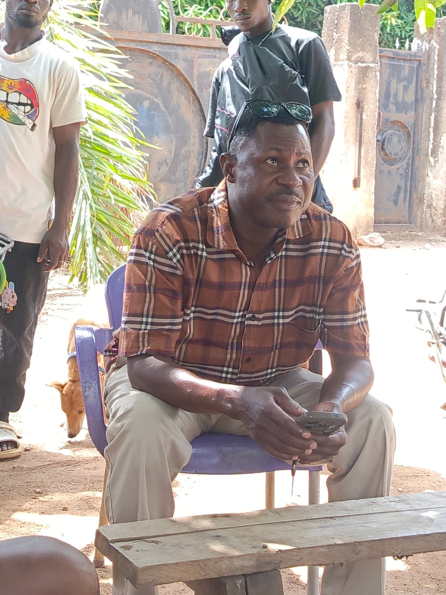 The image was taken outdoors in Akwanga, Nigeria. A man is seated on a purple plastic chair, holding a mobile phone. He is wearing a brown plaid shirt and khaki pants. Sunglasses are resting on his he…read more