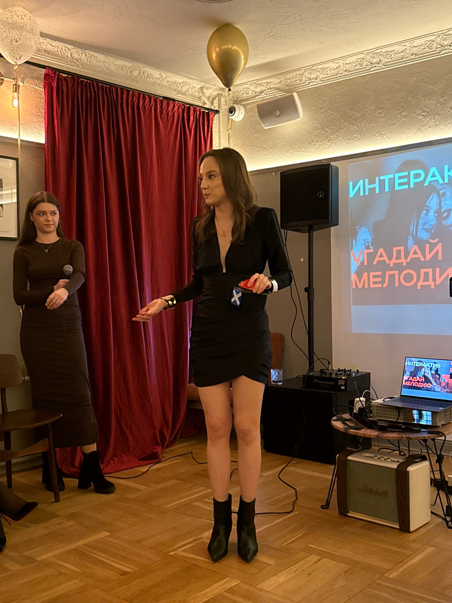 The scene depicts a room during what appears to be an interactive music guessing game, possibly in a bar or entertainment venue, based on the presence of a stage with equipment. The location is likely…read more
