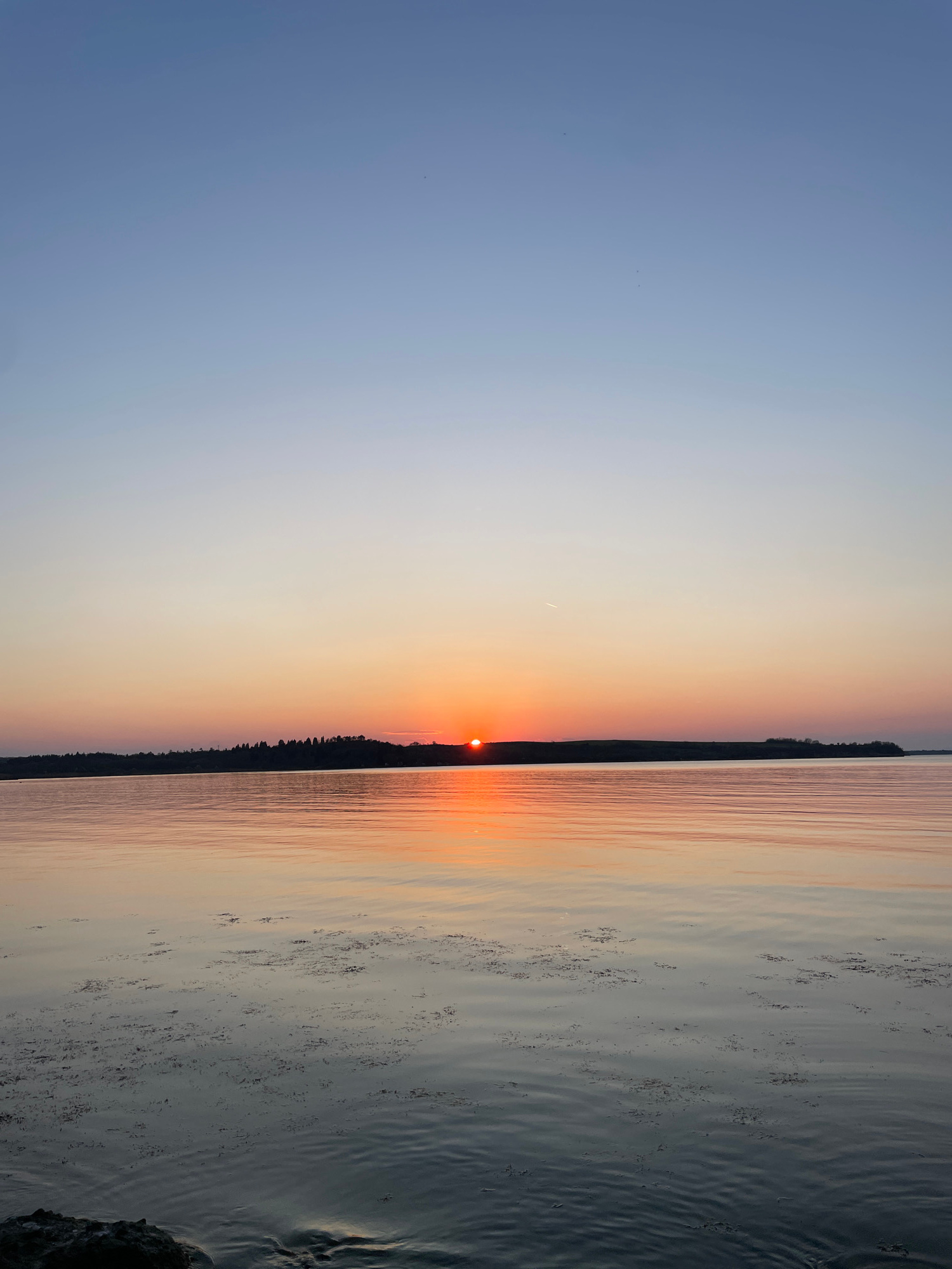 The image shows a sunset over a body of water. The sun is setting on the horizon, casting a red and orange glow on the water and sky. The sky transitions from blue to orange to yellow as it nears the…read more