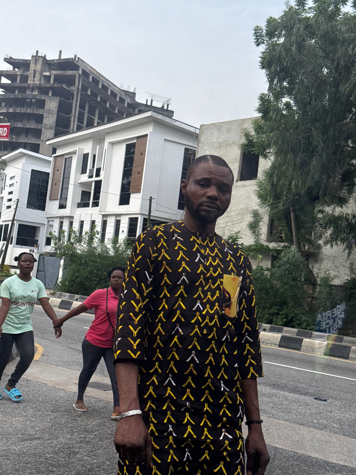 The image shows a man in a patterned shirt standing in Falomo, Nigeria. Behind him are two women holding hands as they walk, and partially-constructed and finished buildings. A street borders the scen…read more