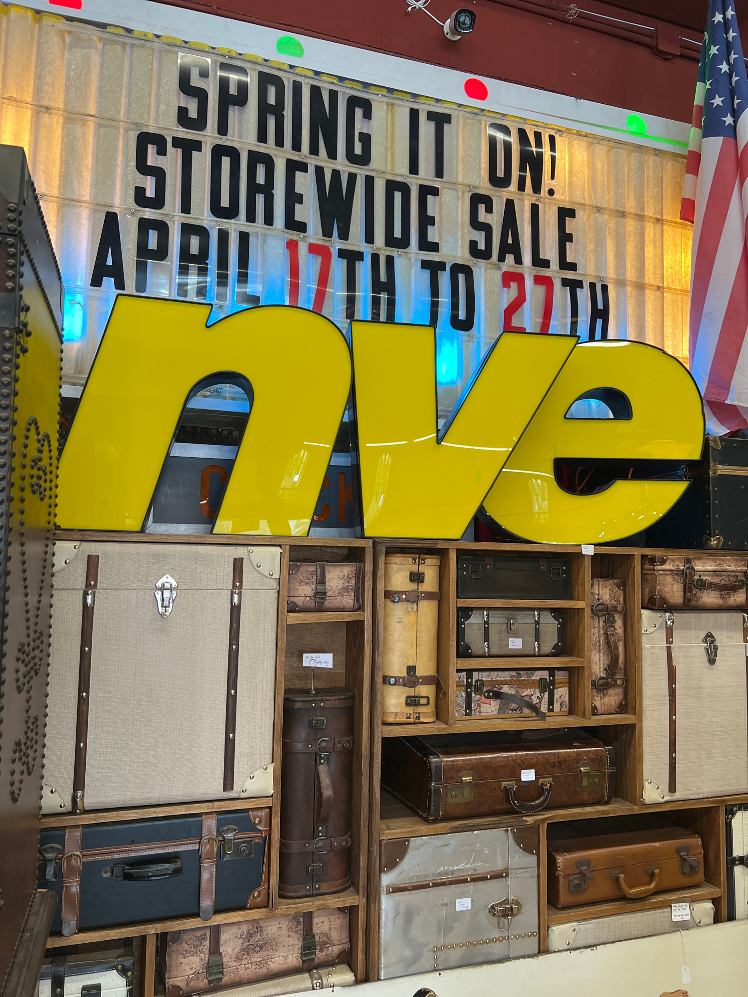 The image depicts a storefront in the City of Newburgh, United States of America. A large, yellow "WE" sign dominates the foreground. Behind it, a window display promotes a "SPRING IT ON! STOREWIDE SA…read more
