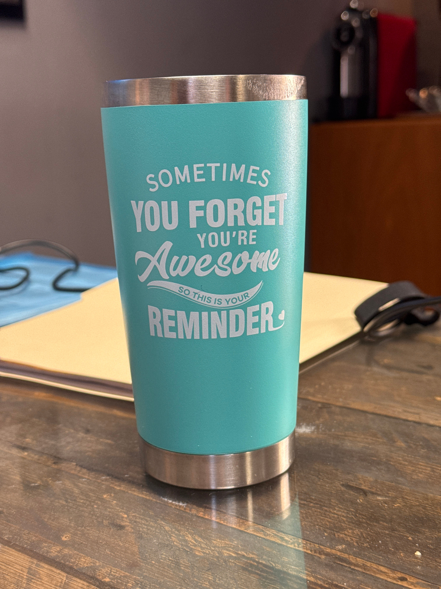 The image displays a teal-colored insulated tumbler resting horizontally on a dark, textured wooden surface. The tumbler features brushed metallic rims at both its top and bottom. Prominently printed…read more