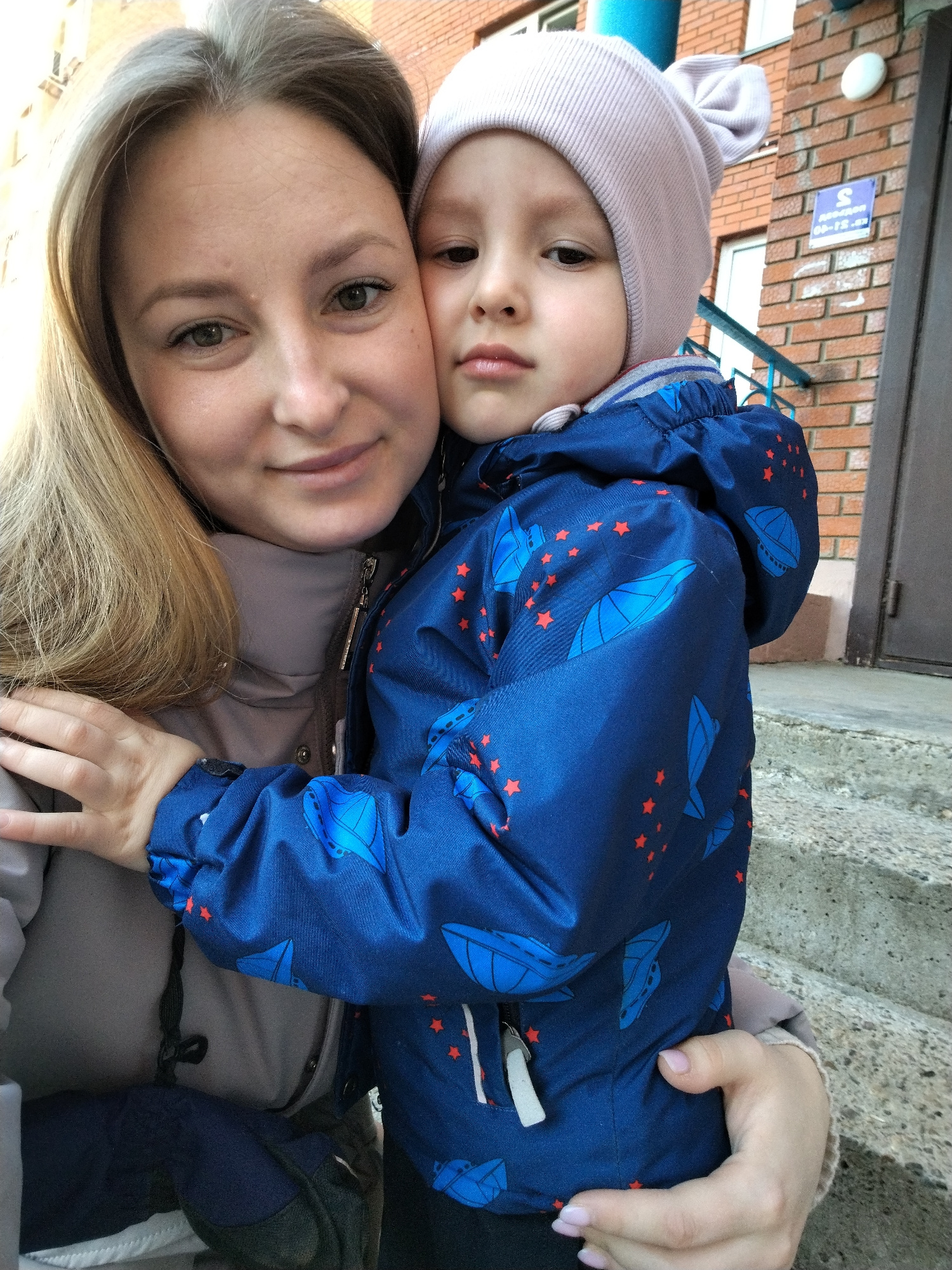 The image depicts a woman and a child in front of a brick building. The woman is fair-skinned with light brown hair and is wearing a gray jacket. She has her arm around the child. The child is wearing…read more