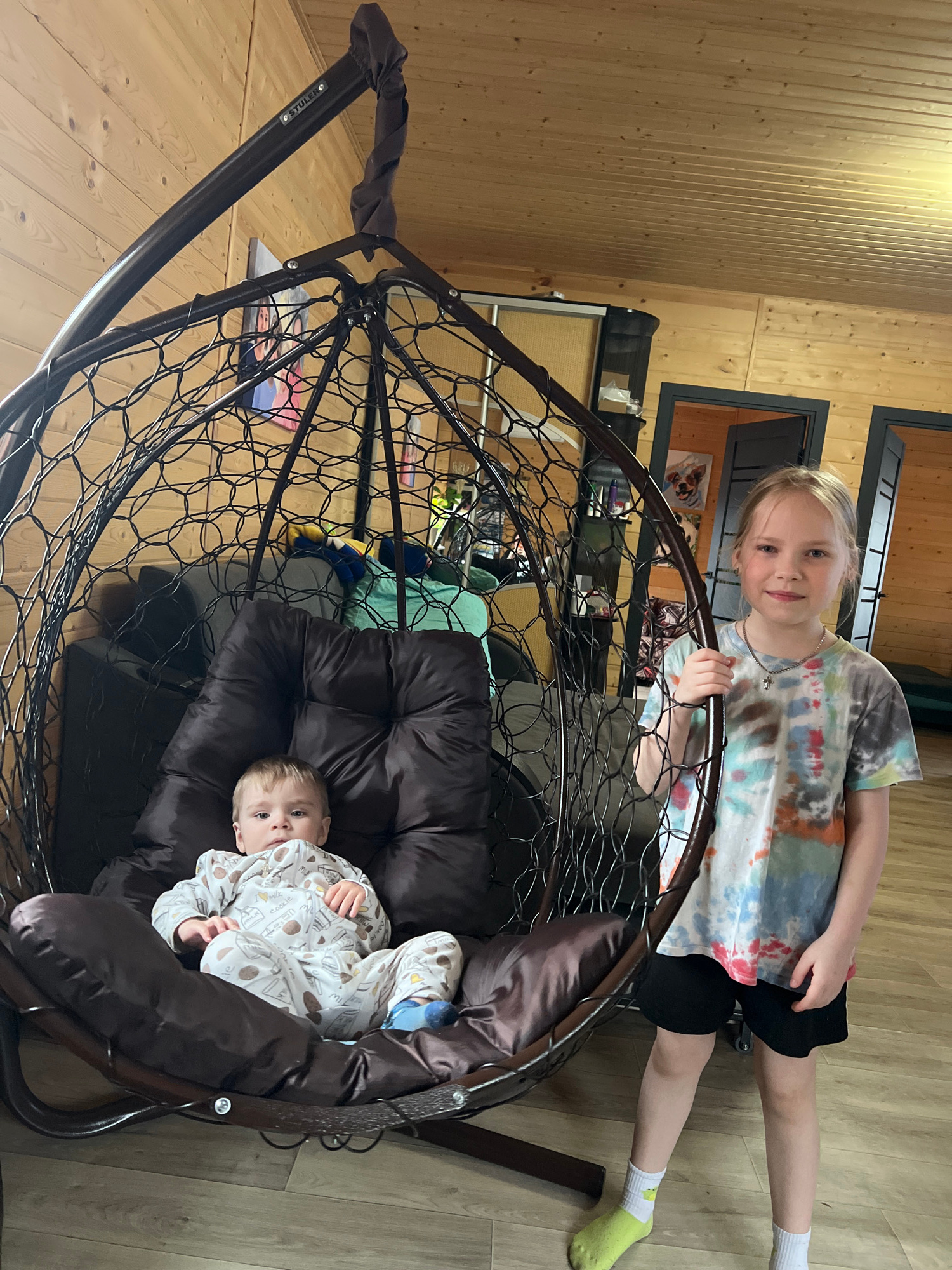 Two Caucasian children are present in an indoor setting. One child, a girl, is standing beside a hanging chair with a webbed frame and brown cushions. She is wearing a tie-dye shirt, black shorts, and…read more