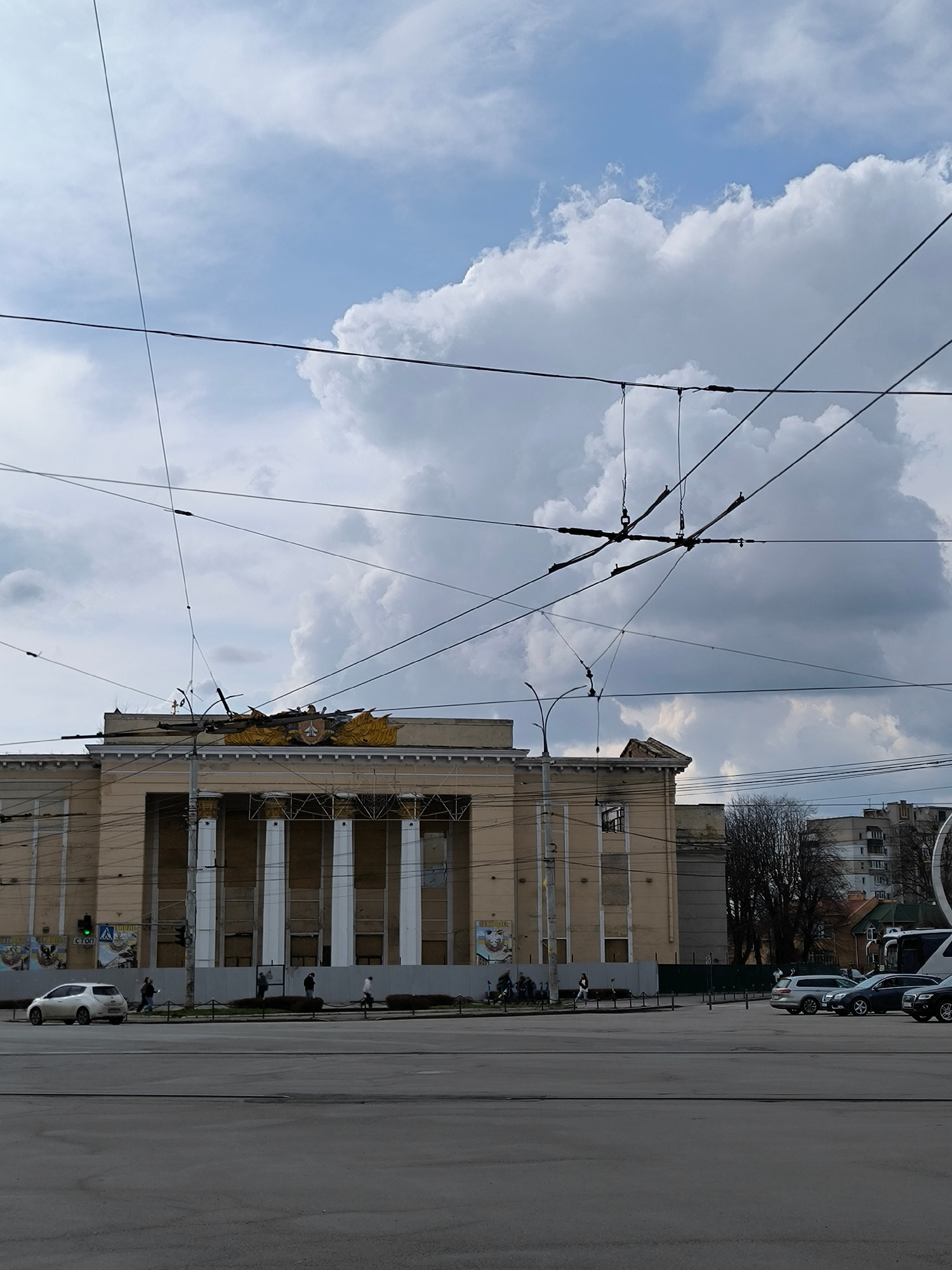 The image depicts a street scene in Vinnytsia, Ukraine, dominated by the façade of the Vinnytsia Regional Philharmonic building. The building has a classical architectural style, with a row of promine…read more
