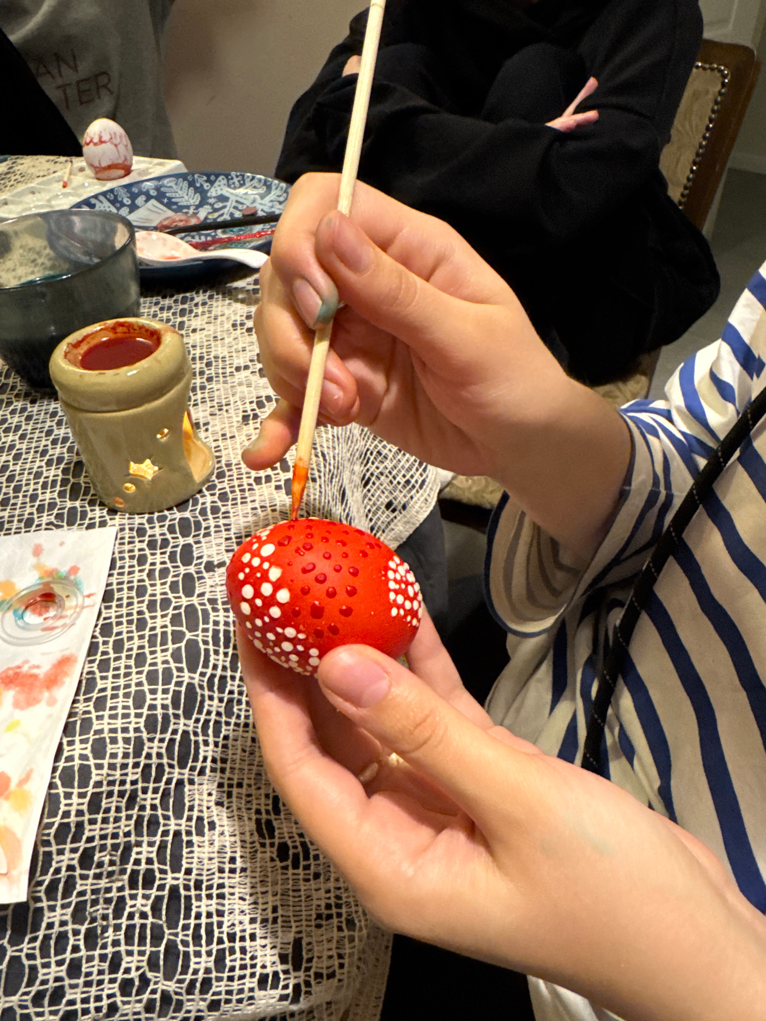 A person in a blue and white striped shirt is shown painting a red egg with white polka dots. The person is holding a thin paintbrush in their left hand, which is dipped in a small container of red pa…read more