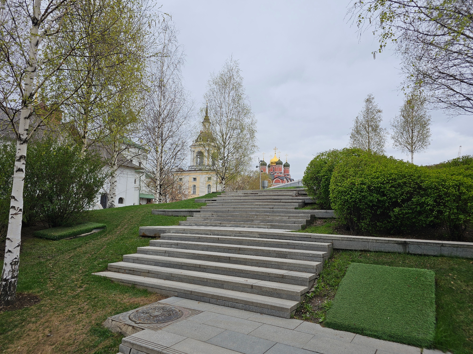 The image depicts a set of wide, stone steps leading up a grassy hill in Zaryadye Park, Moscow, Russia. The steps are bordered by green bushes and patches of artificial turf. In the background, there…read more