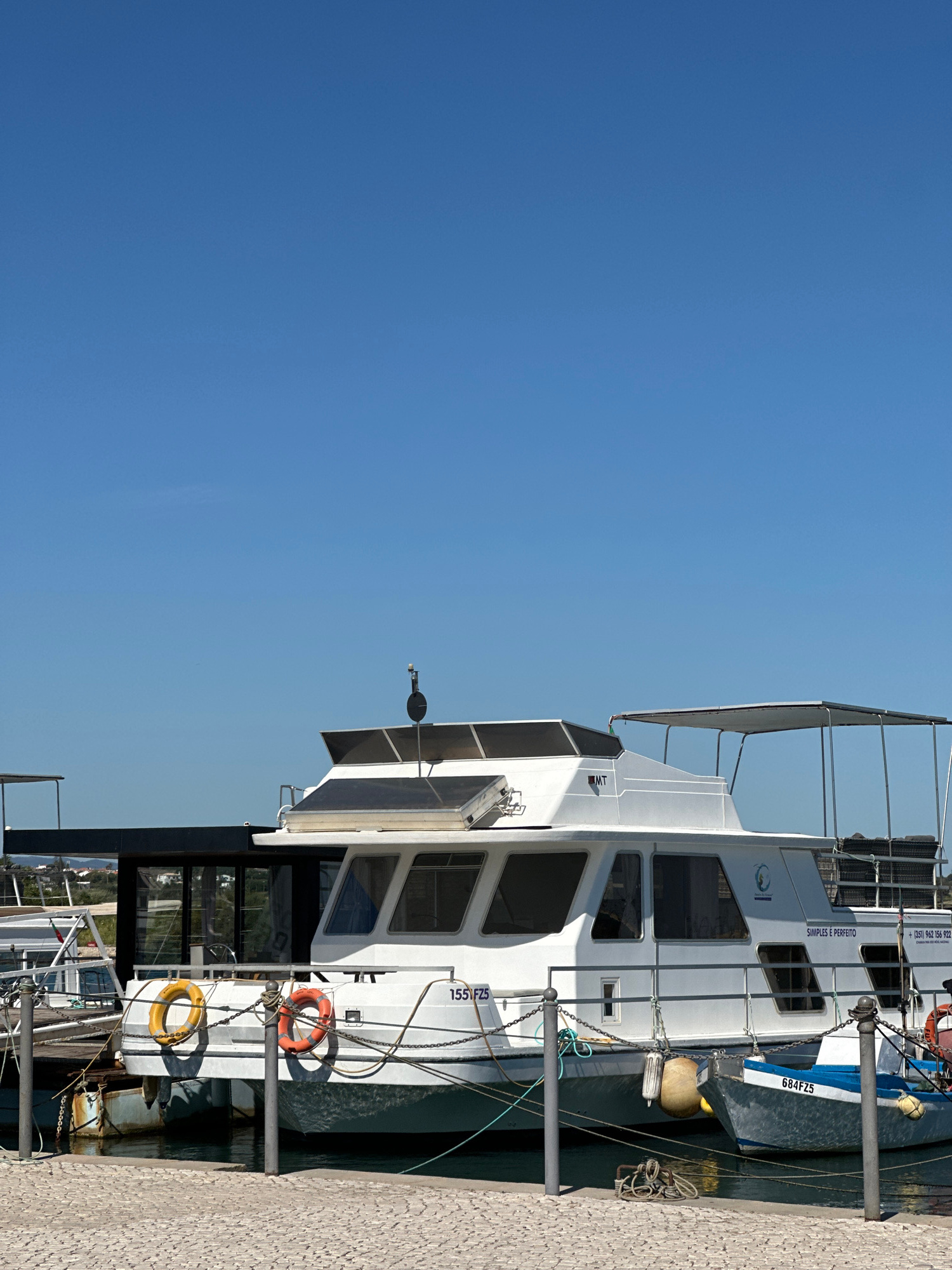 The image captures a vessel docked in what appears to be the city of Olhão, Portugal. The sky is a clear, bright blue, contrasting with the white and gray structure of the boat. Visible on the vessel…read more
