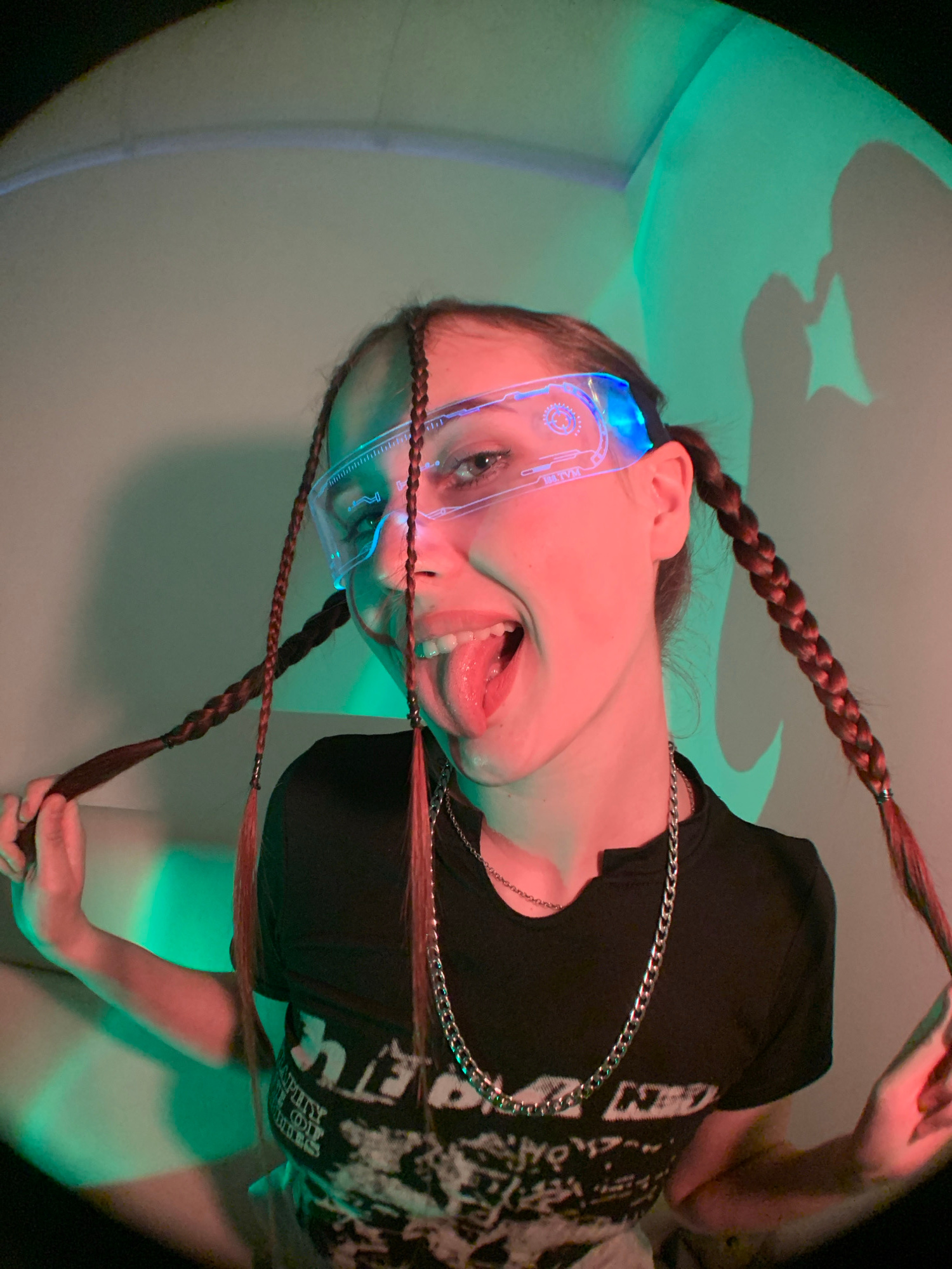 A person is shown from a low angle, rotated counterclockwise. The person is wearing futuristic blue-lit goggles and has brown braids, holding one braid in each hand. They are wearing a black T-shirt w…read more