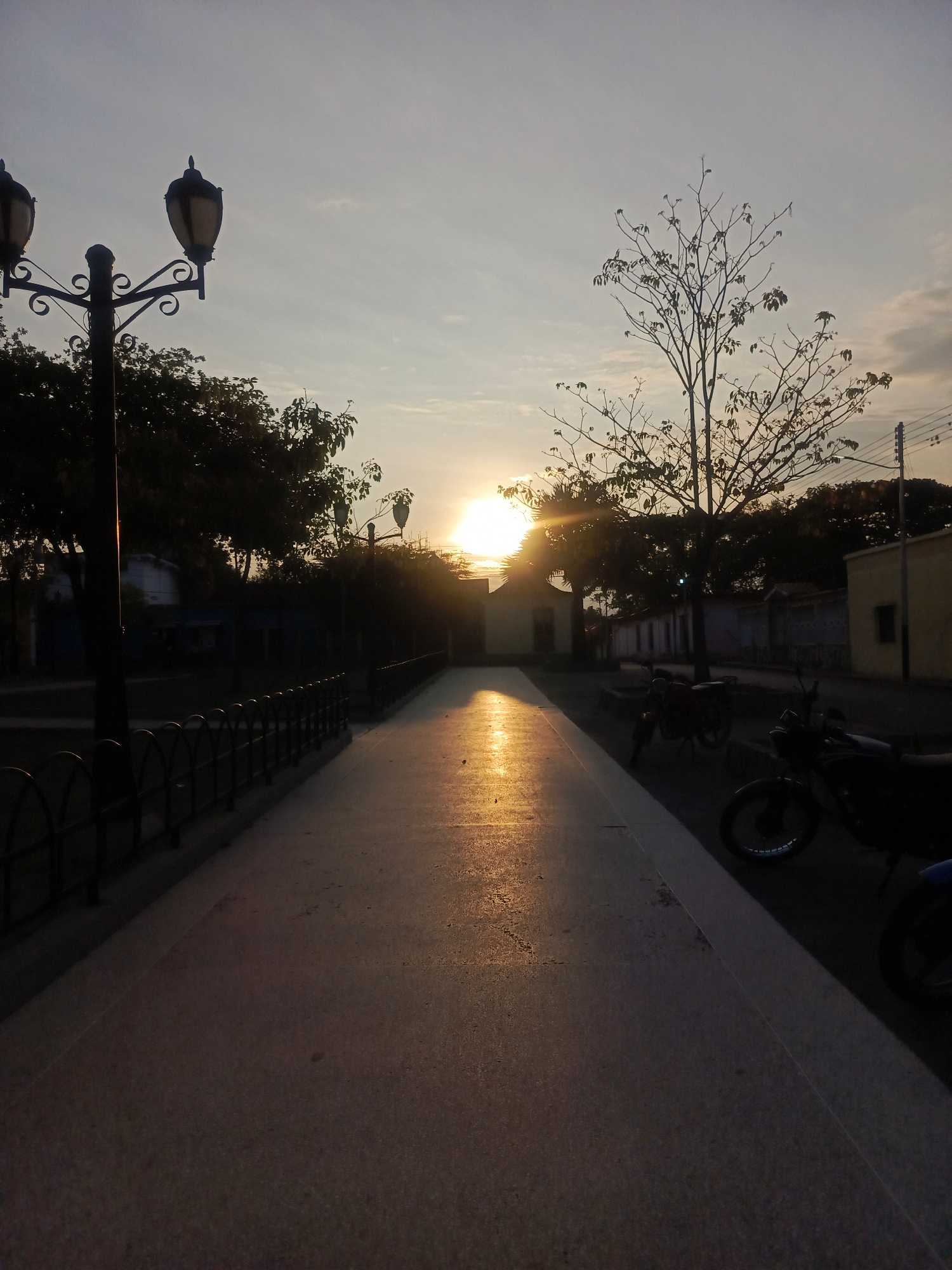 The image shows a street scene in Tinaco, Venezuela during sunset. The road is paved and reflects the light of the setting sun. On the left side of the road, there is a black metal fence and a streetβ¦read more