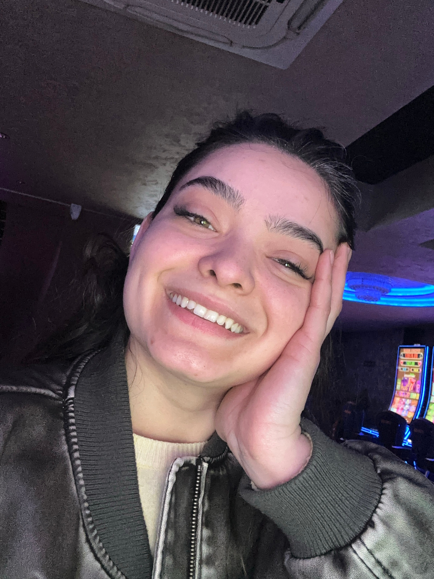 A young woman poses for a selfie indoors. She is smiling broadly with her hand on her cheek. She is wearing a dark jacket with a ribbed cuff. In the background, there is a slot machine, and the lighti…read more