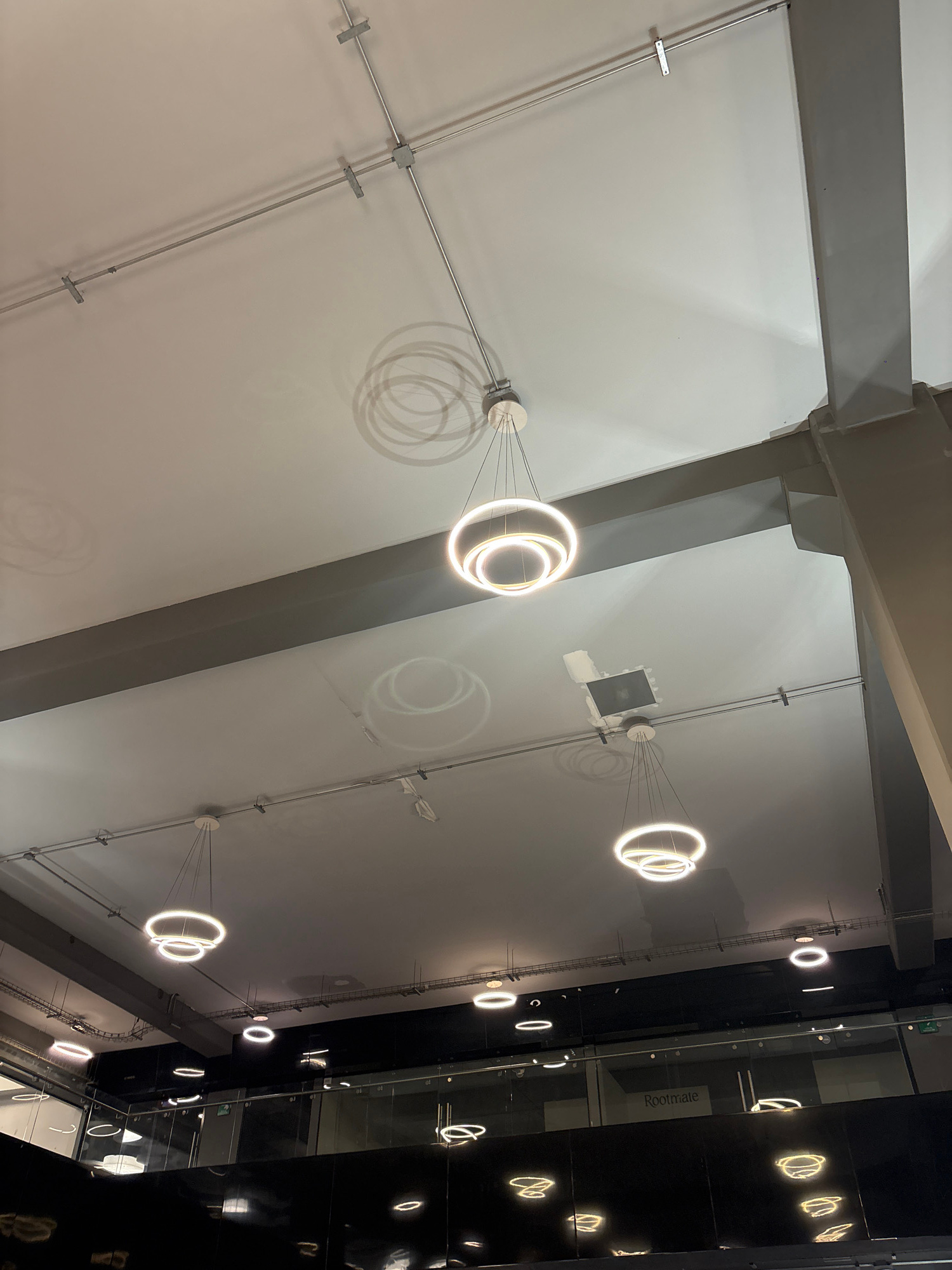 The image presents an upward view of a modern interior space, likely a commercial or public building in Puebla, Mexico. The ceiling is primarily white with visible structural beams and conduits runninβ¦read more