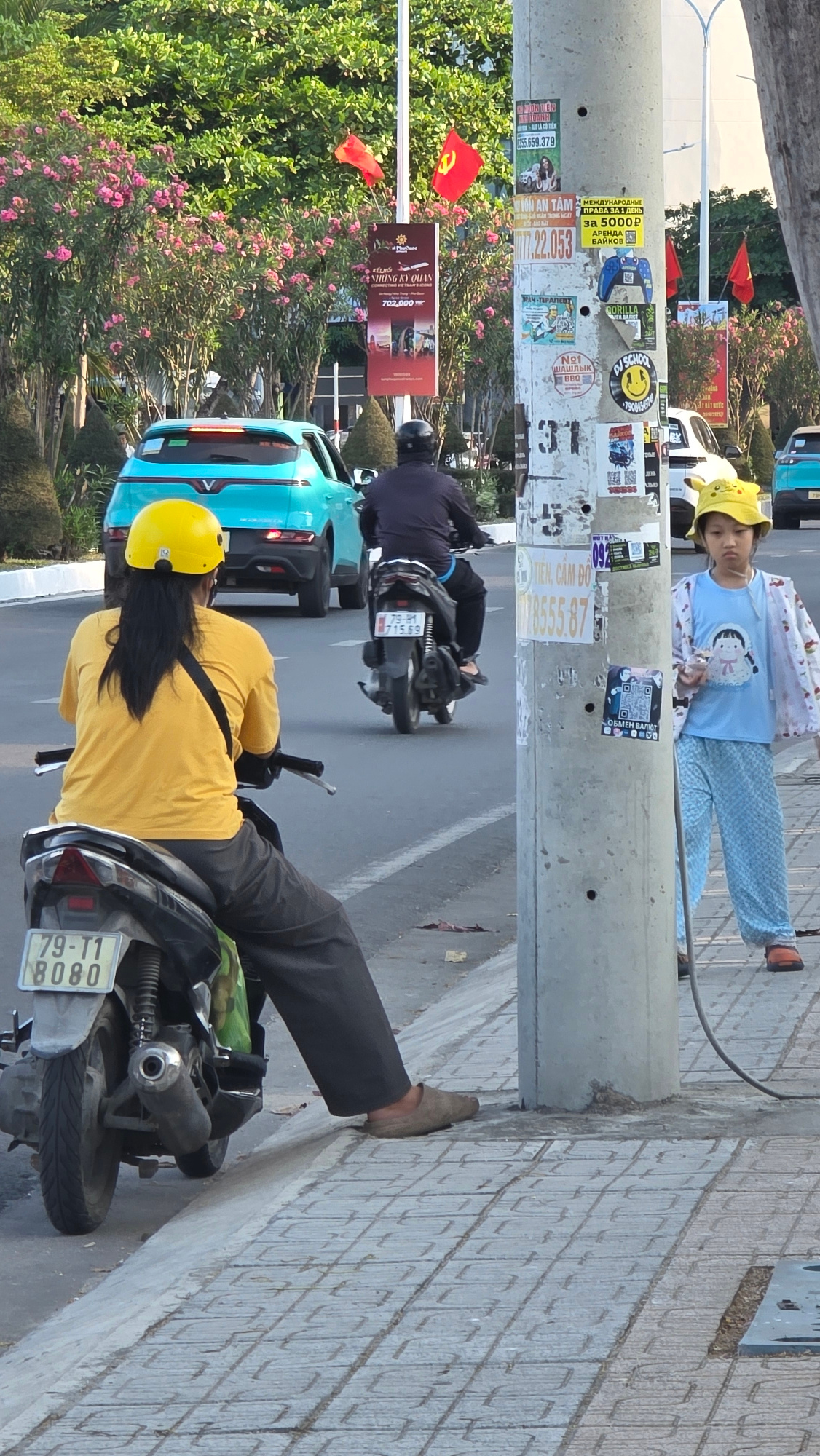 This image captures a vibrant street scene, likely in Bắc Nha Trang, Vietnam, characterized by common urban elements and local culture. The perspective is tilted, showcasing a sidewalk, a road, and th…read more