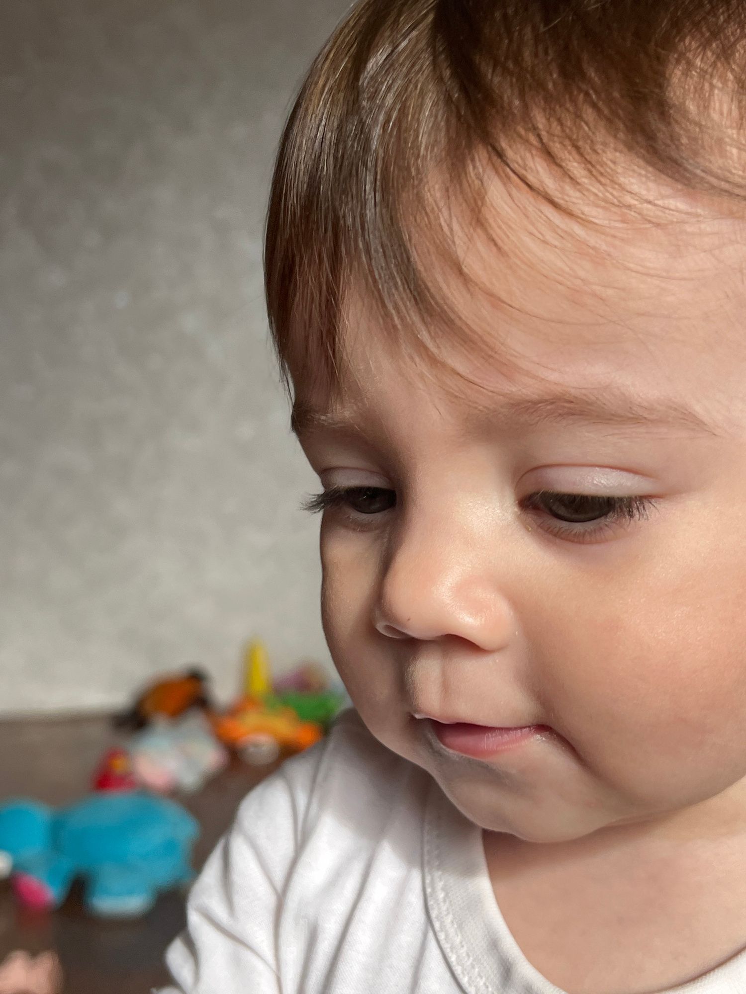 A close-up, eye-level portrait captures an infant in what is stated to be a location in Elena, Bulgaria. The child, with fair skin, light brown hair parted to the left and swept across the forehead, a…read more